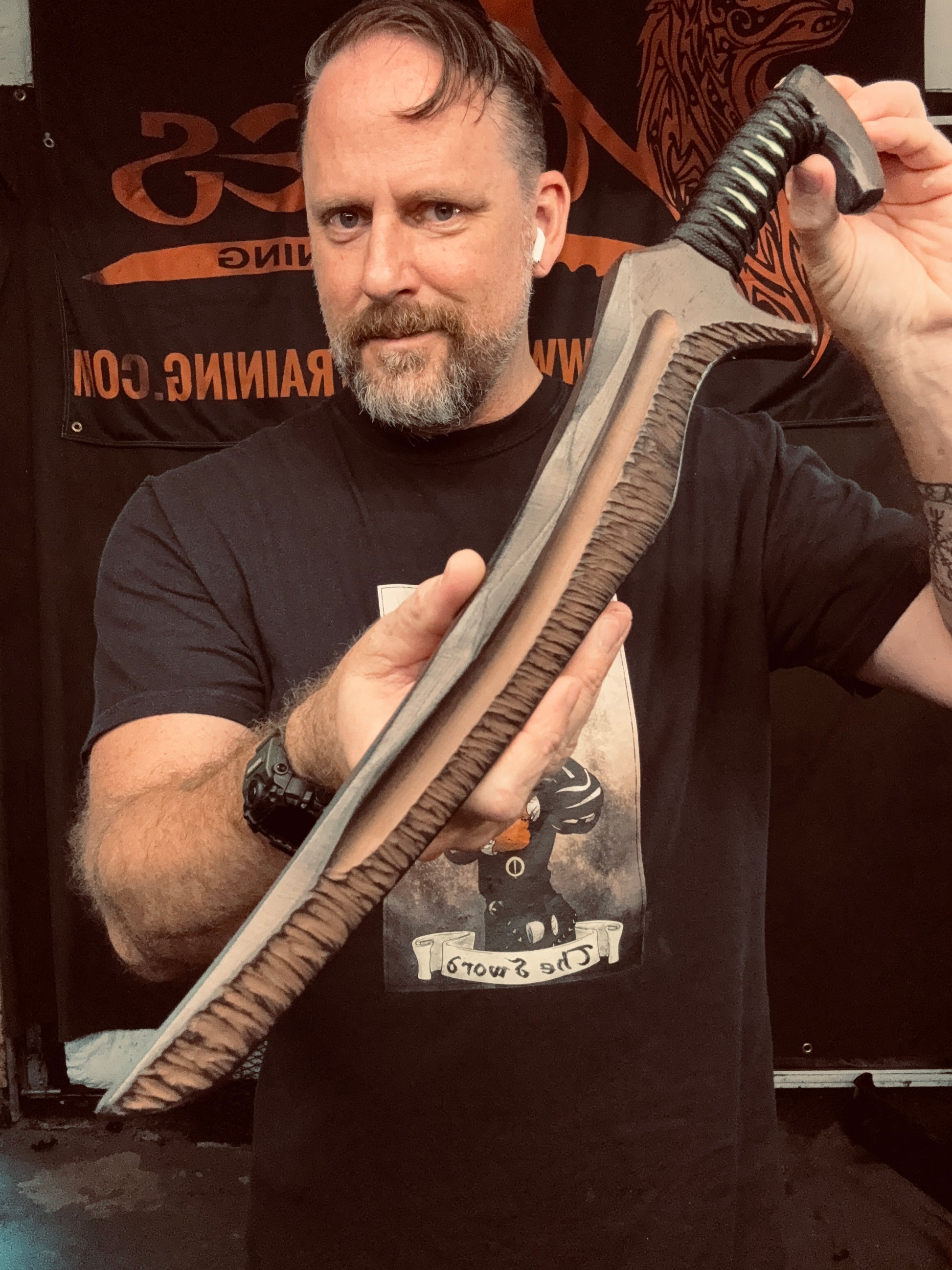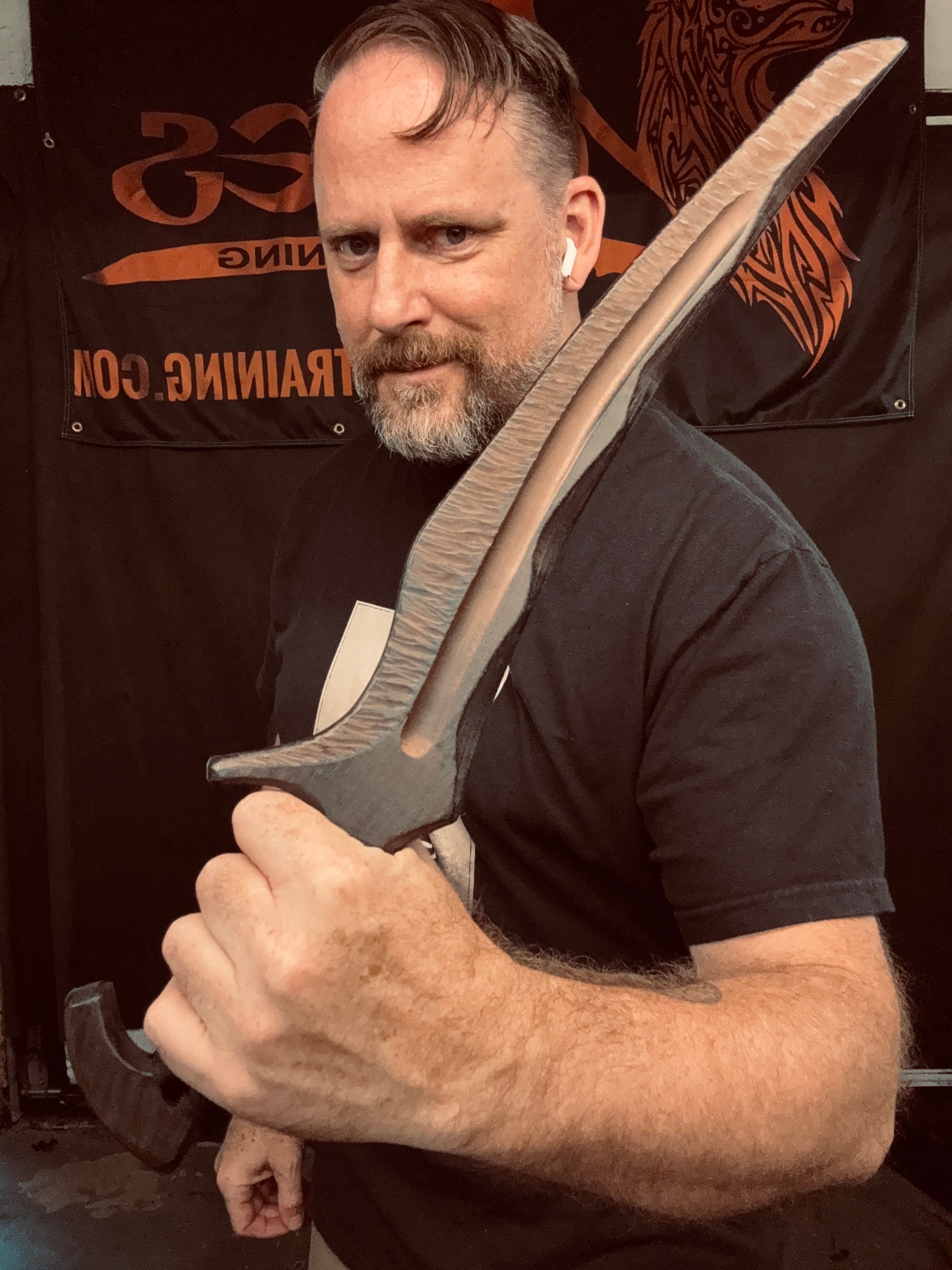 Handcrafted from 3/4” thick HDPE polymer. This dagger trainer will help you train for mighty adventures or make an excellent costume prop. Or both! It is well balanced and moves like lightning. 13 1/2” blade with an overall length of 20”. My hand textured Dragon Hide and copper patina finish adds to the adventure. Handle features a resin infused Tsukamaki style wrap with a glow in the dark under layer. Weighs 10.3.