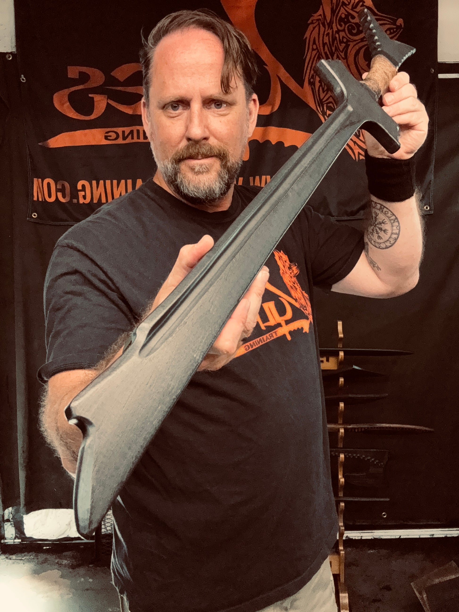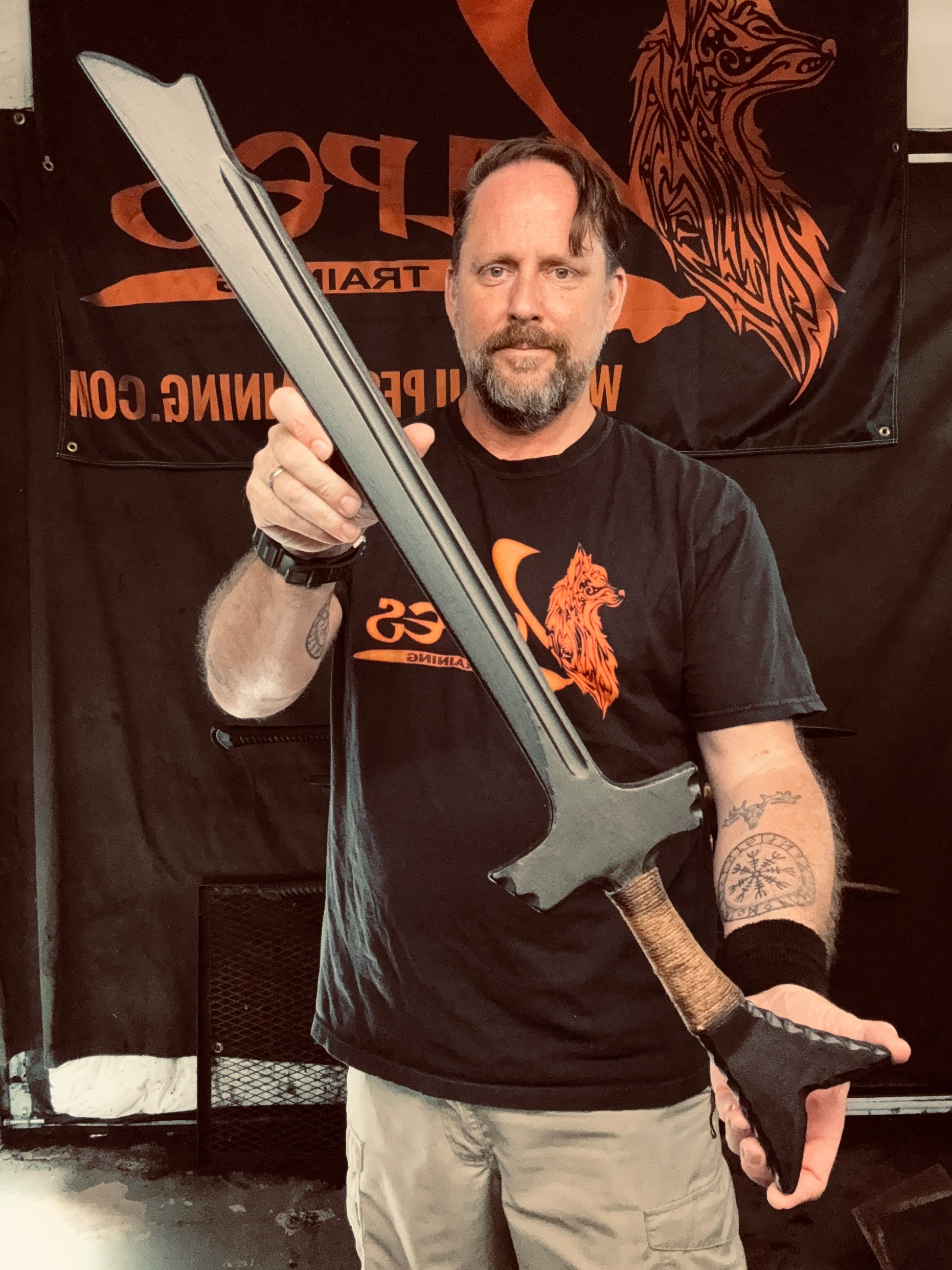 Hand ground from 3/4” thick polymer stock. The 24” hand ground blade is matched with a flame treated jute wrapped handle. The jute is infused with marine grade resin to create a grippy and permanent , phenolic handle wrap. Blade and pommel feature our hand textured Dragon Hide Finish. Weighs 1 lb 8 oz , 34 1/2” overall length with a 24” blade. Blade length can be adjusted upon request.