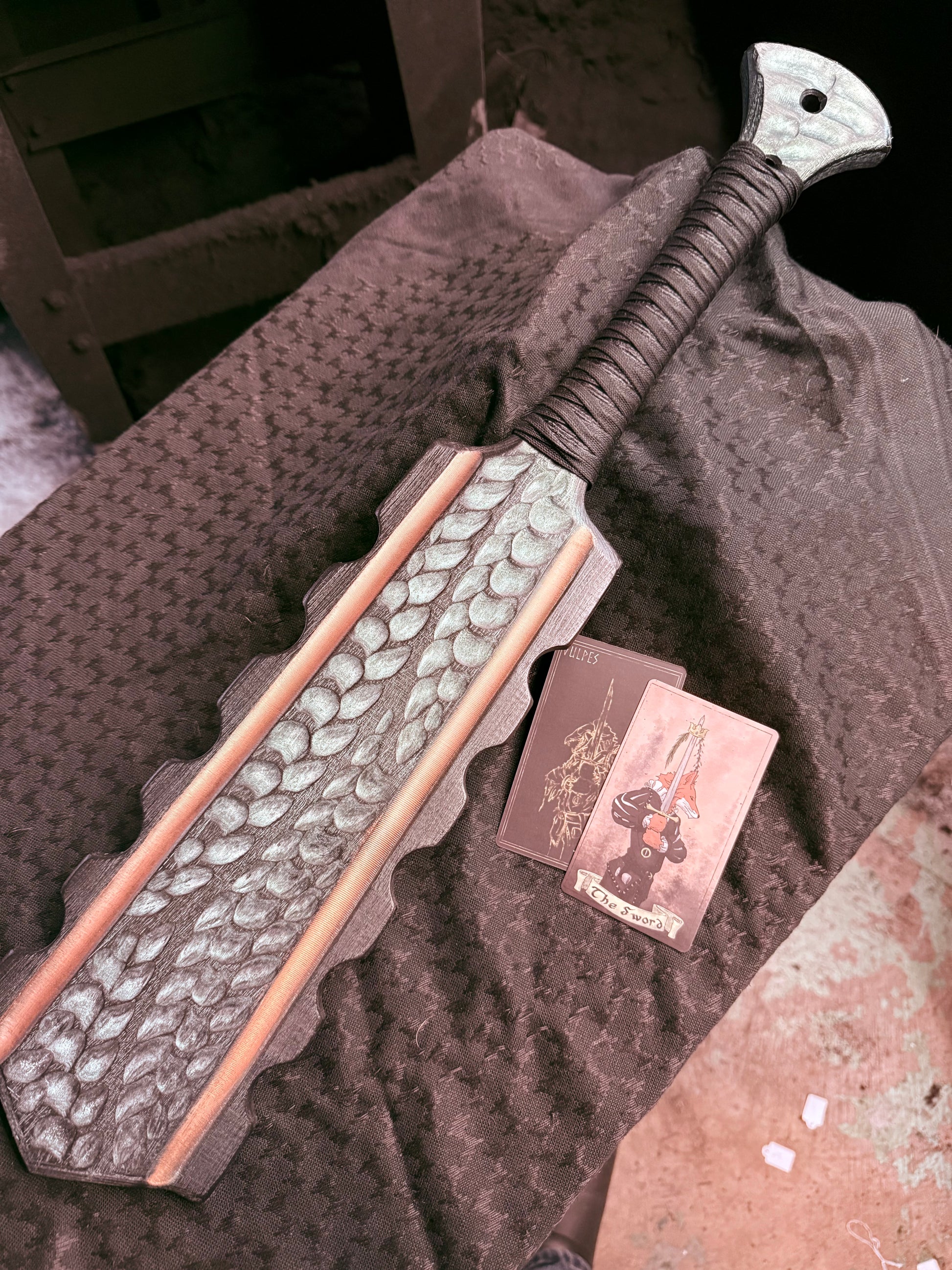 Handcrafted from 3/4” thick polymer. This Macuahuitl war club is 24” overall and weighs 1 lb 9 oz. Features a flame treated jute wrapped handle. The jute is infused with marine grade resin to create a grippy and permanent , phenolic handle wrap. It’s is then covered with a resin infused Tsukamaki style wrap . The blade is hand ground and hand textured featuring an aged bronze patina with polished bronze patina details.