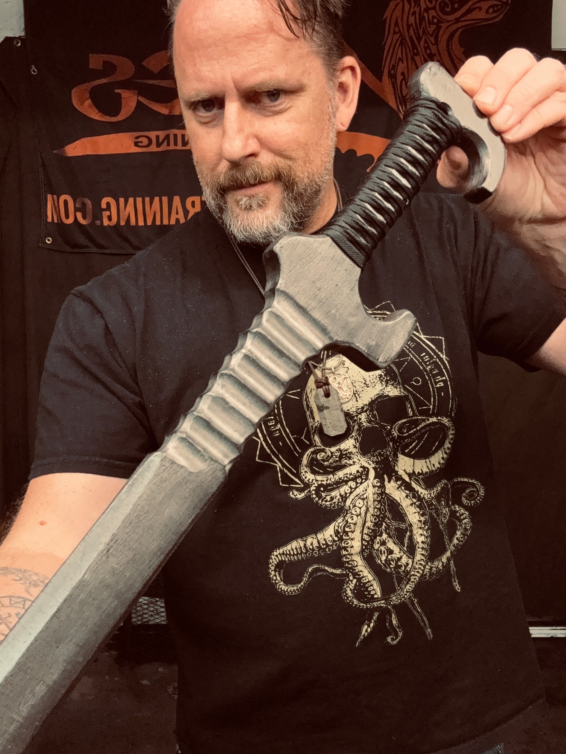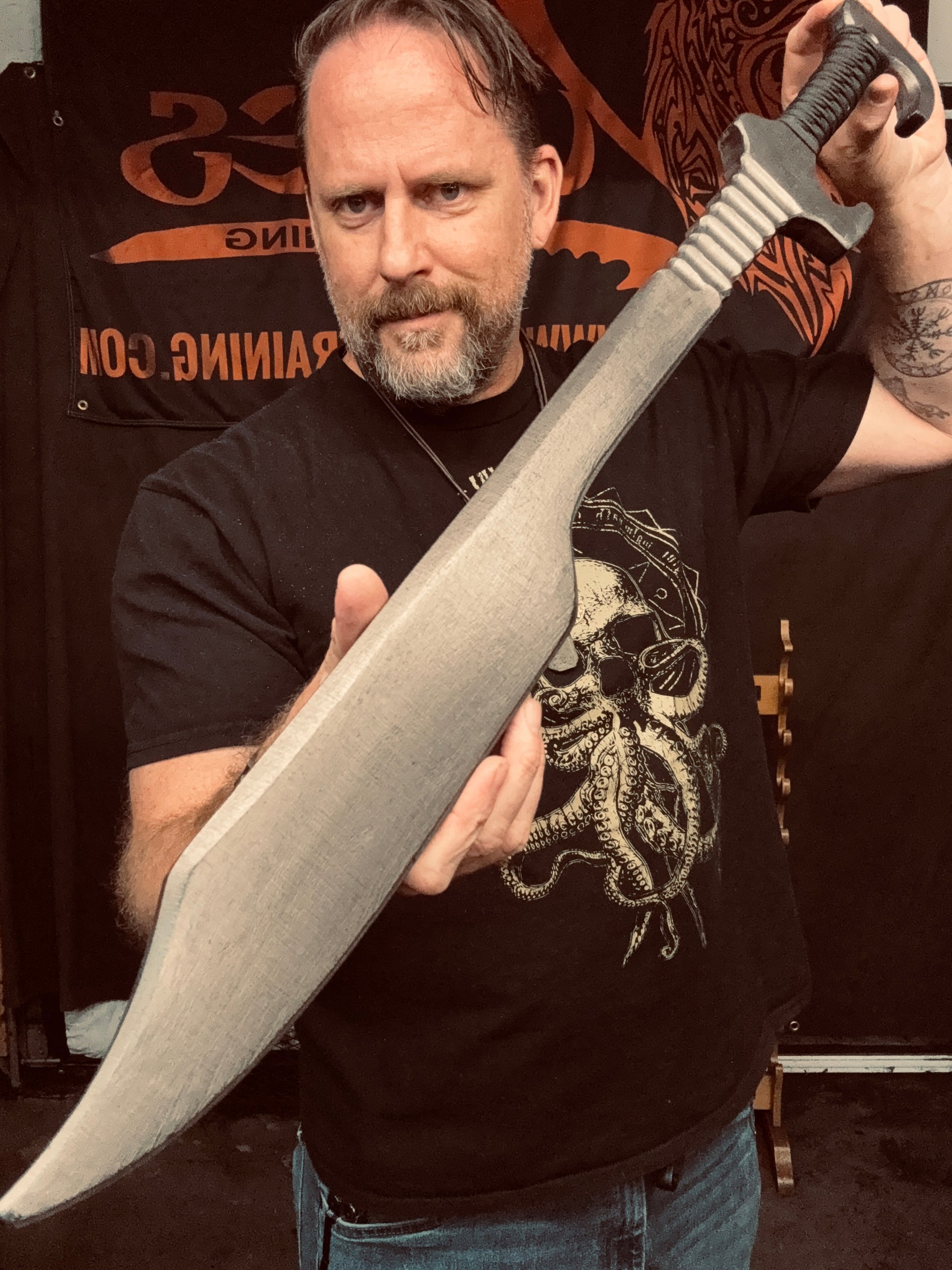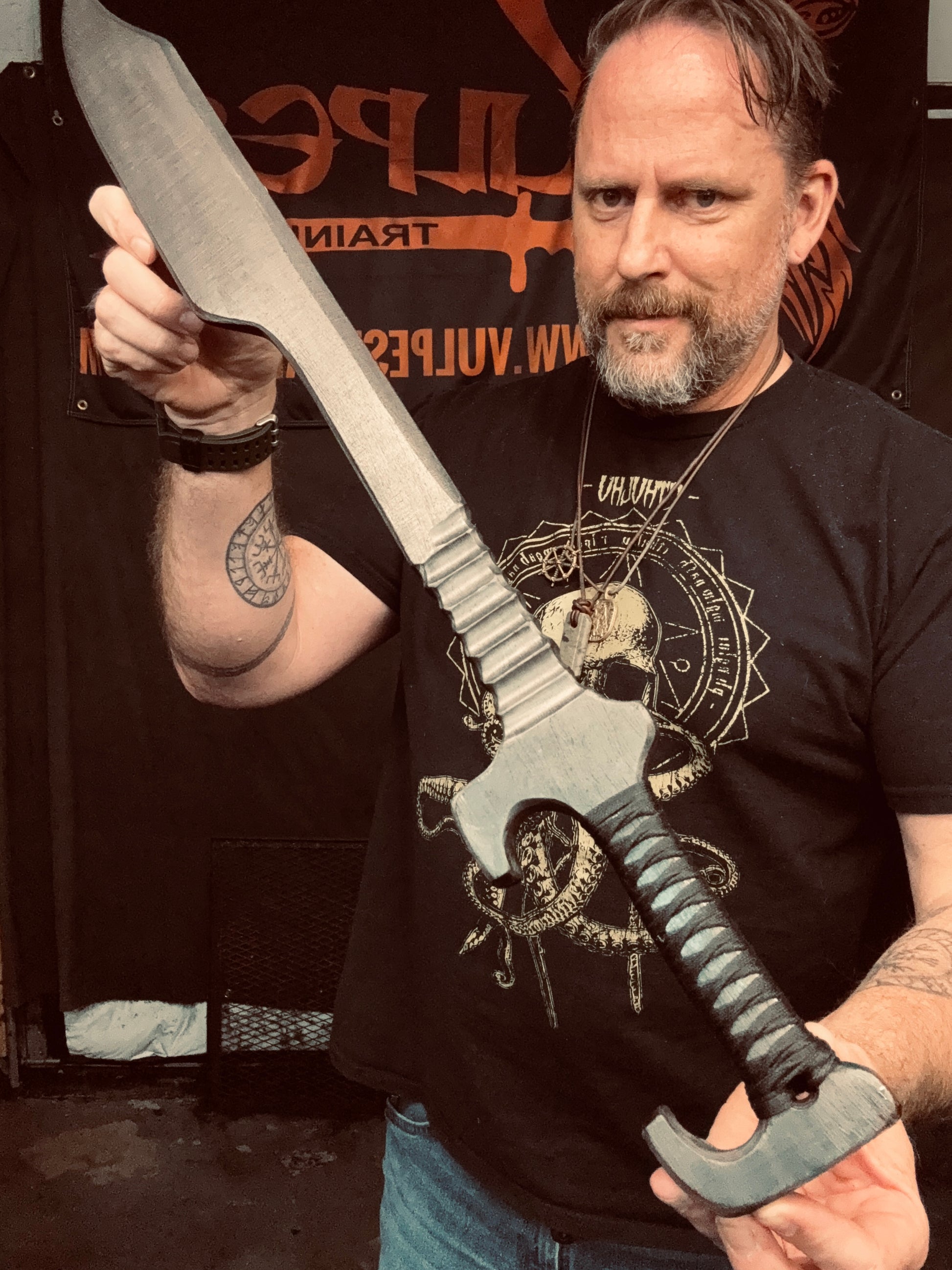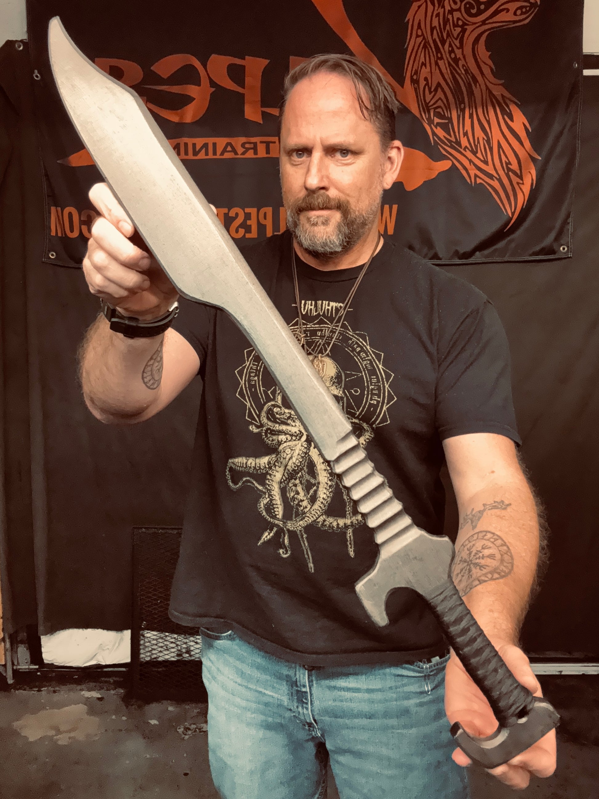 When weapons are your religion and your job is hunting across the galaxy, you need the right tools and training. The Bounty Hunter Alpha is handcrafted from 3/4” thick HDPE polymer. The 22” hand ground blade features a battle worn gunmetal patina. The handle bears a resin infused Tsukamaki style cord wrap that gives an excellent grip. 29” overall length. Weighs 1 lb. 2 oz. Keep your helmet on and your aim true.