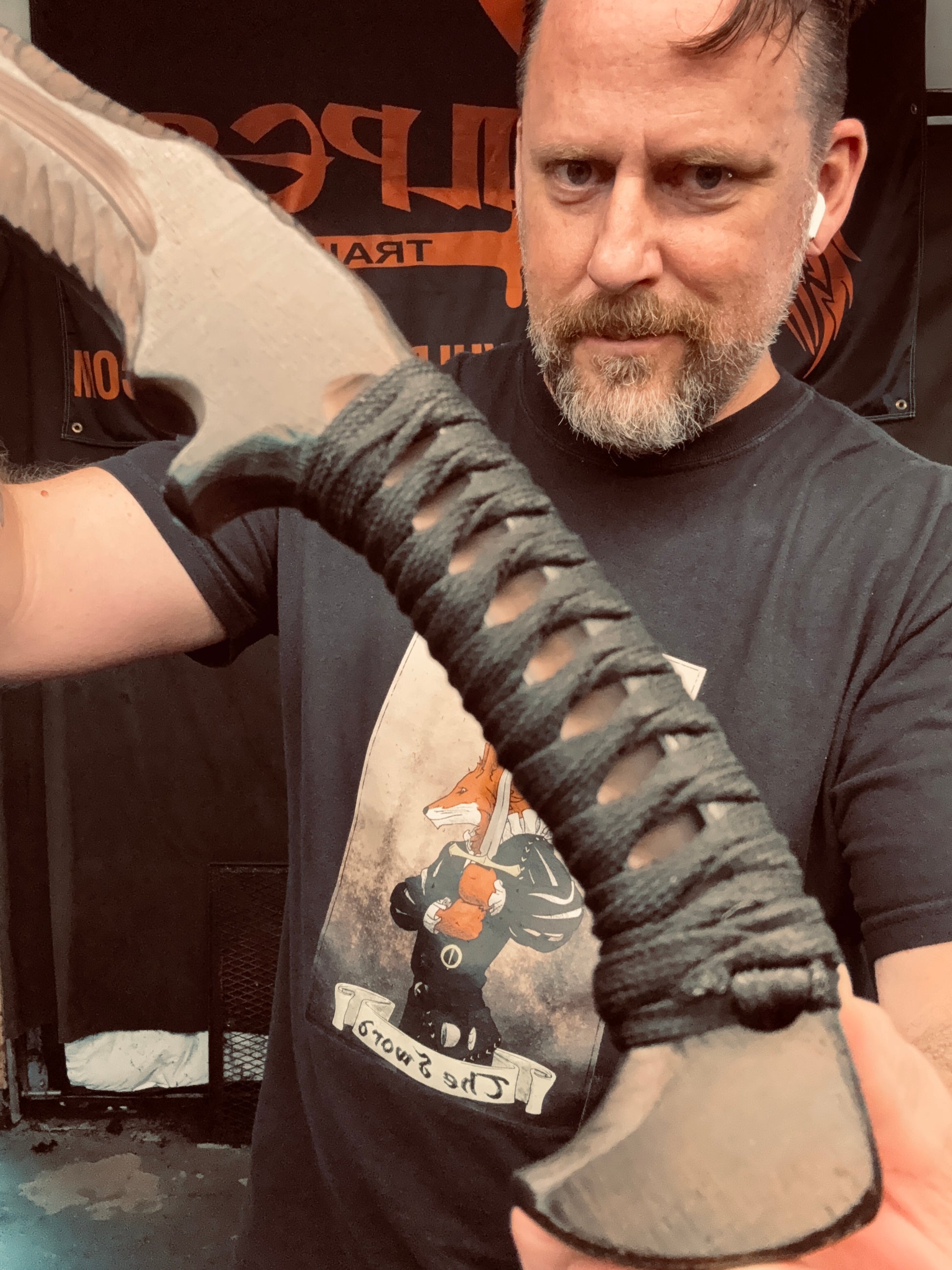 Handcrafted from 3/4” thick HDPE. The hand ground blade is matched with a handle featuring a hand wrapped resin infused Tsukamaki style wrap. Blade and pommel feature hand texturing and a weathered rust finish. . 24” overall length. Weighs 13 oz