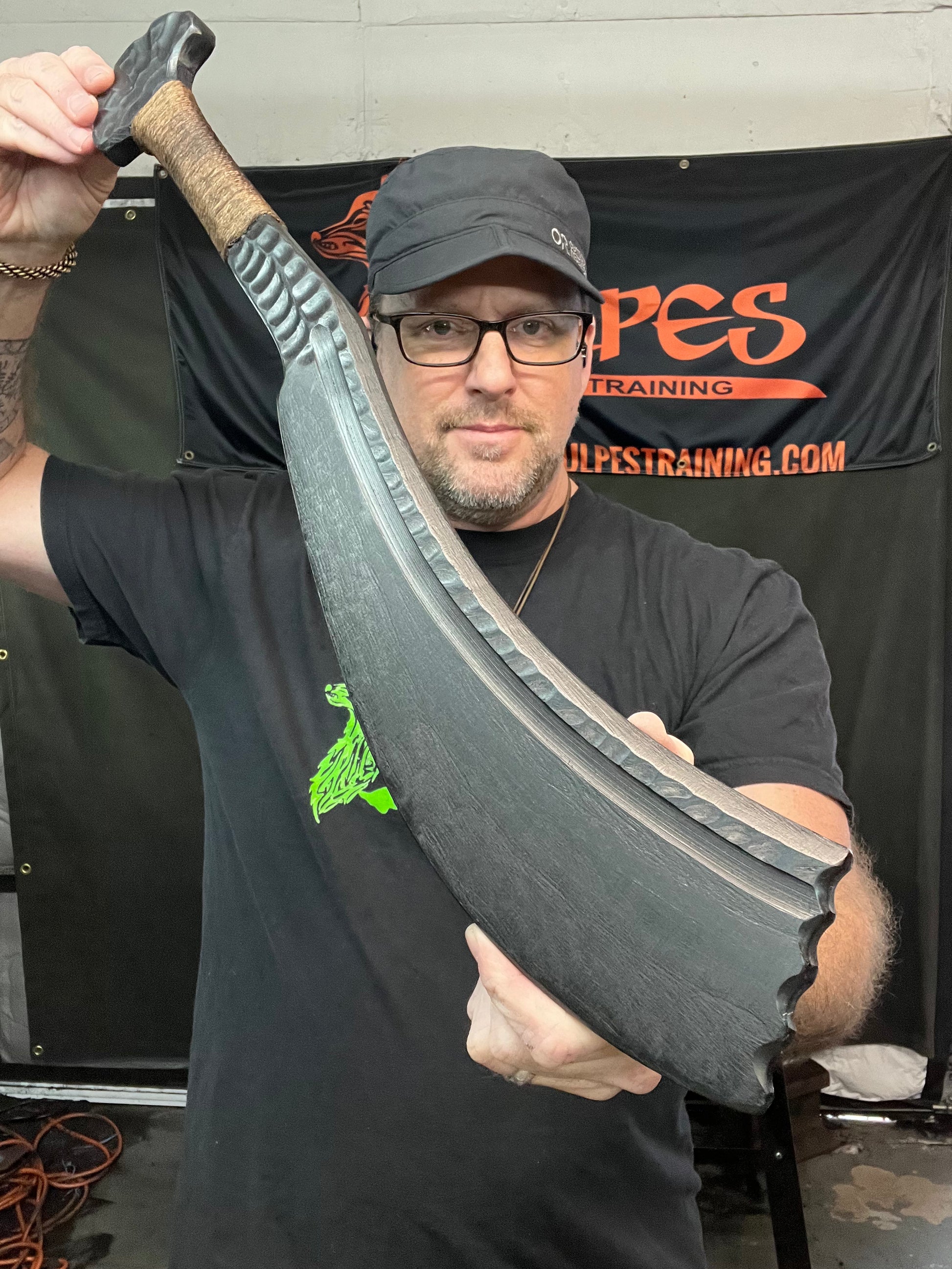 Handcrafted form 3/4” HDPE polymer. This trainer uses its well tuned balance to move its powerful blade. The curved 13” blade is convex ground from spine to edge. A textured handle and carved pommel give you control over its 1 lb 3oz weight. Train like the legendary Agojie warriors of Dahomey. 23 3/4” overall length.