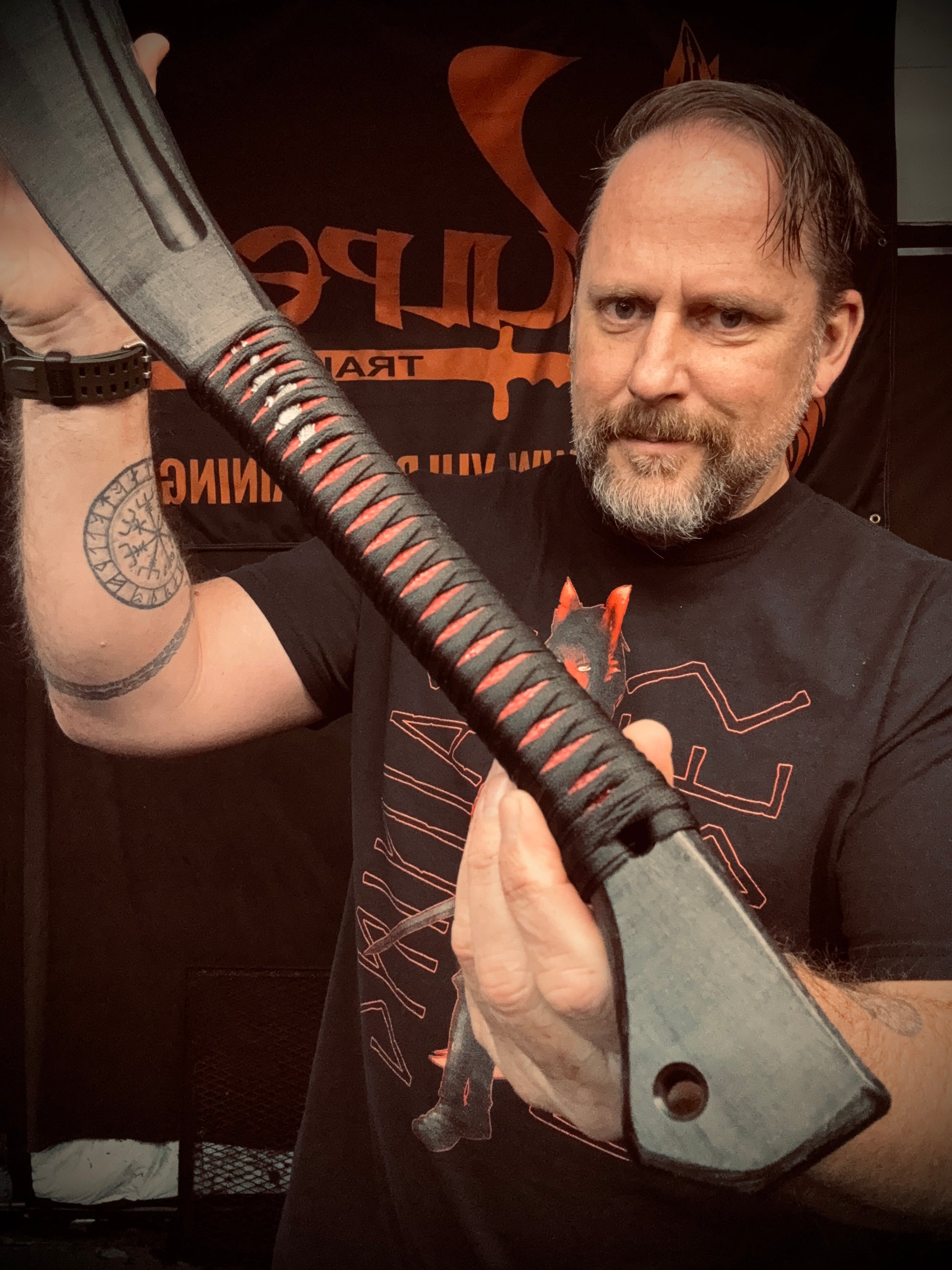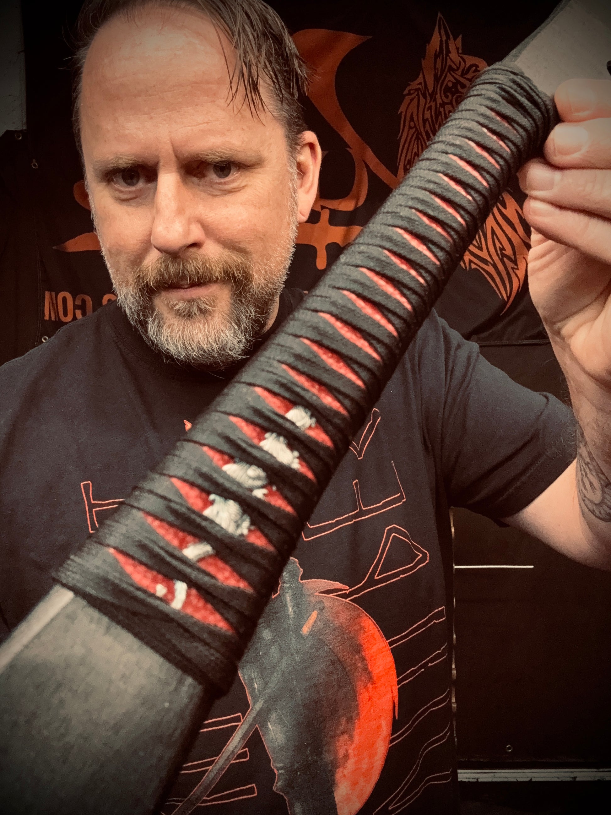 Handcrafted from 3/4” thick HDPE polymer. A fierce war club that handles like a sword! This 32 1/2” hand ground , two handed war club is matched with a handle wrapped in a resin infused Tsukamaki wrap over synthetic waterproof leather samegawa with dragon menuki . Blade and pommel feature my hand textured wood grain finish. Weighs 1 lb 15 oz.