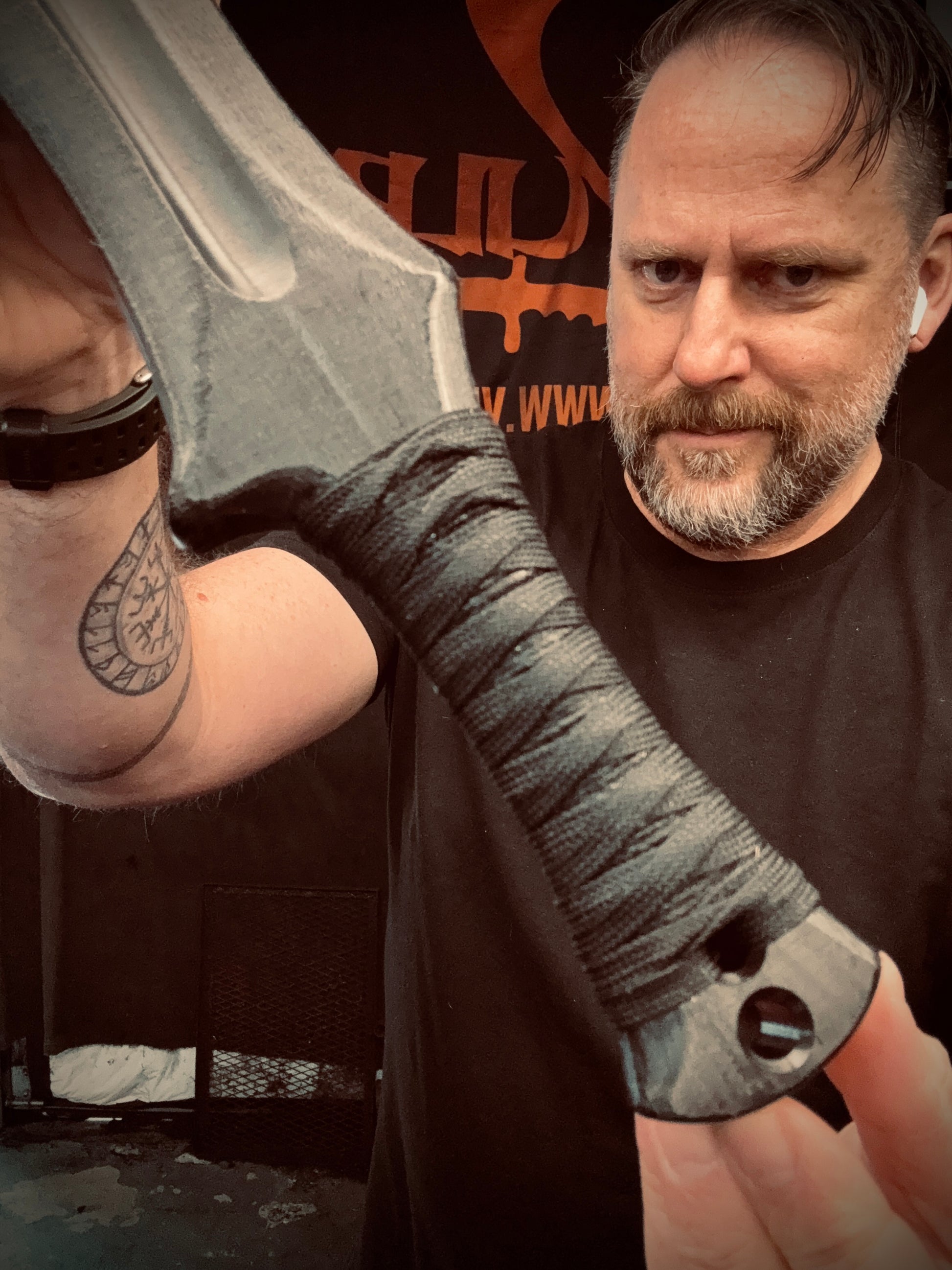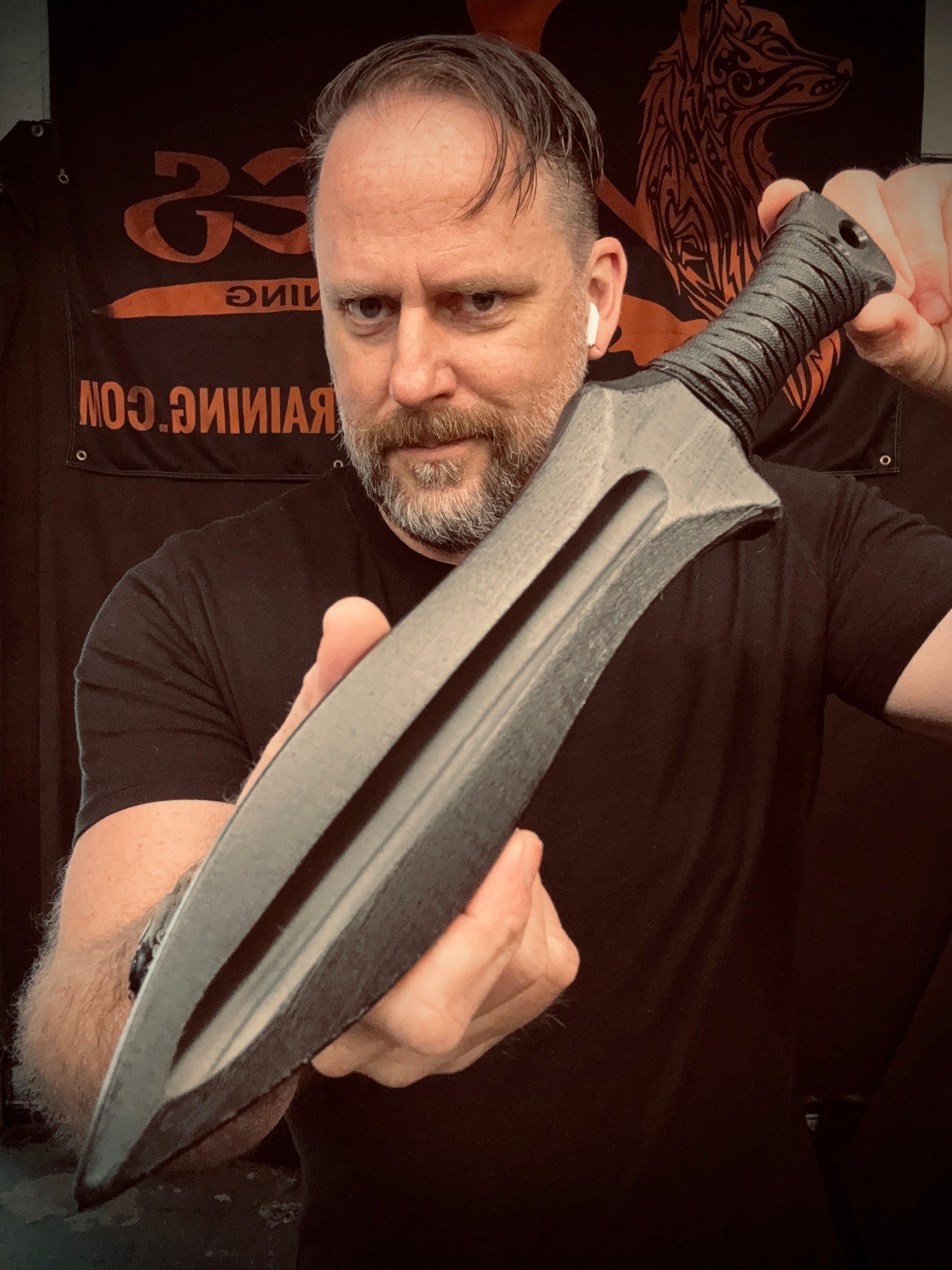 Handcrafted from 3/4” thick HDPE polymer. A stout fantasy dagger built for hard training or as a perfect addition to your costume. Features a 9” handground, double beveled , hand textured blade. The handle is wrapped with layer of black flame treated jute . It is then covered with a Tsukamaki style wrap and is saturated with marine grade resin to create a grippy and permanent handle wrap. 15” overall. Weigh 9 oz..