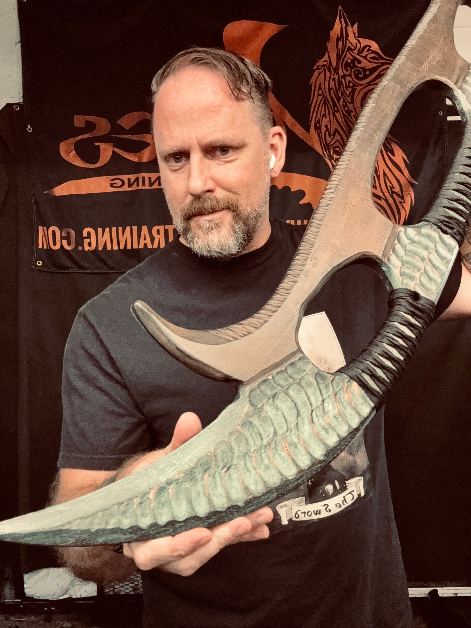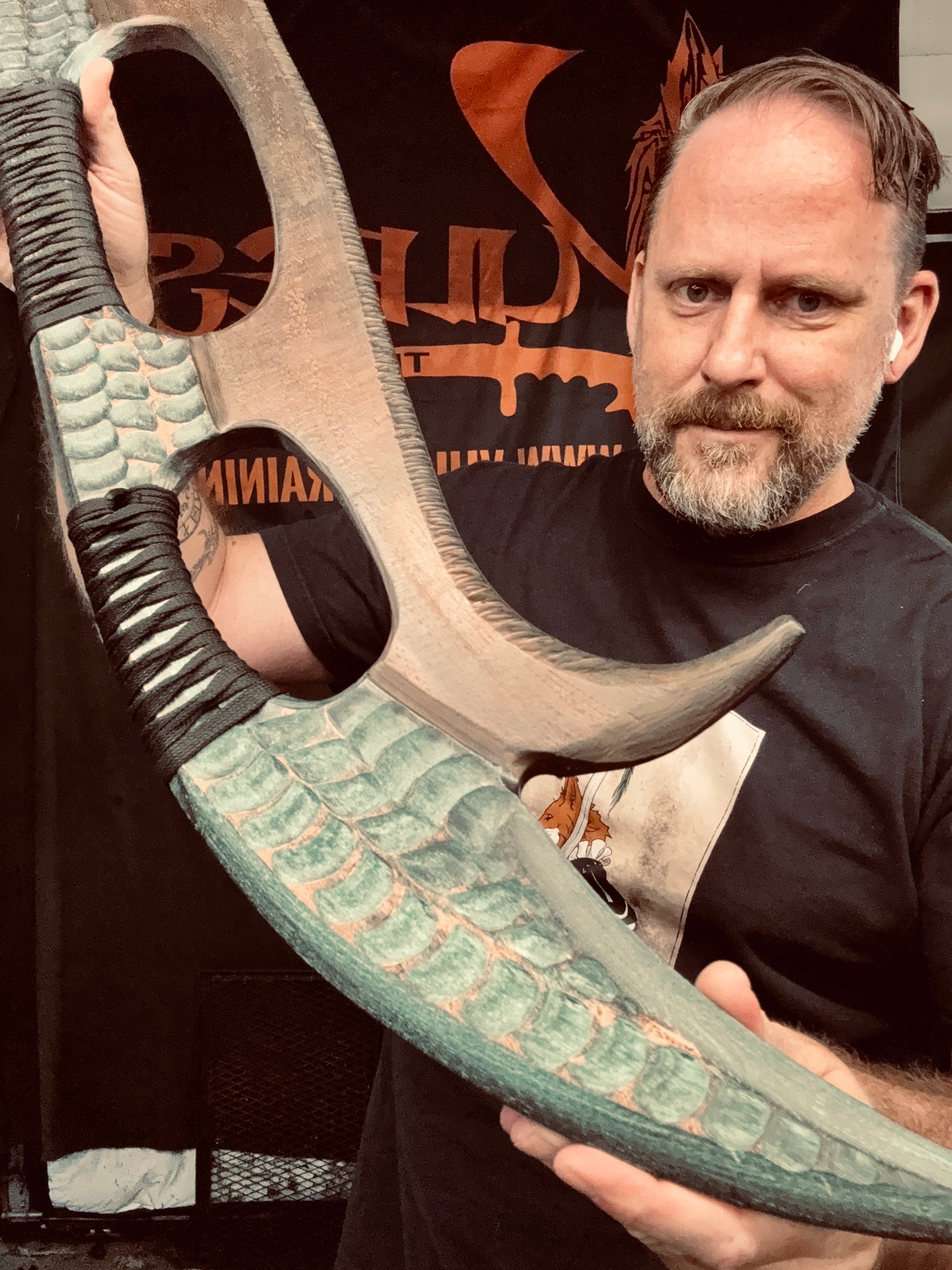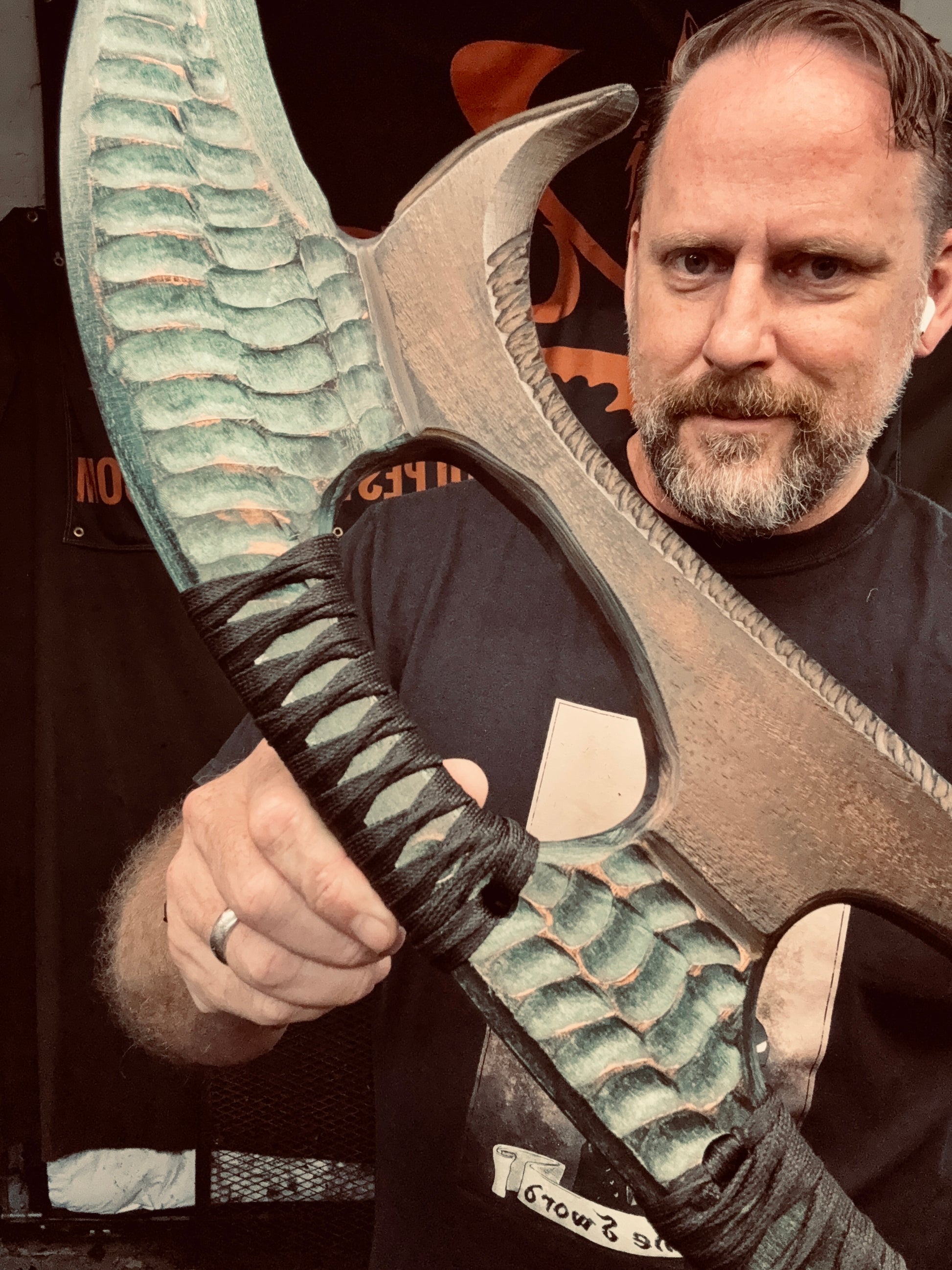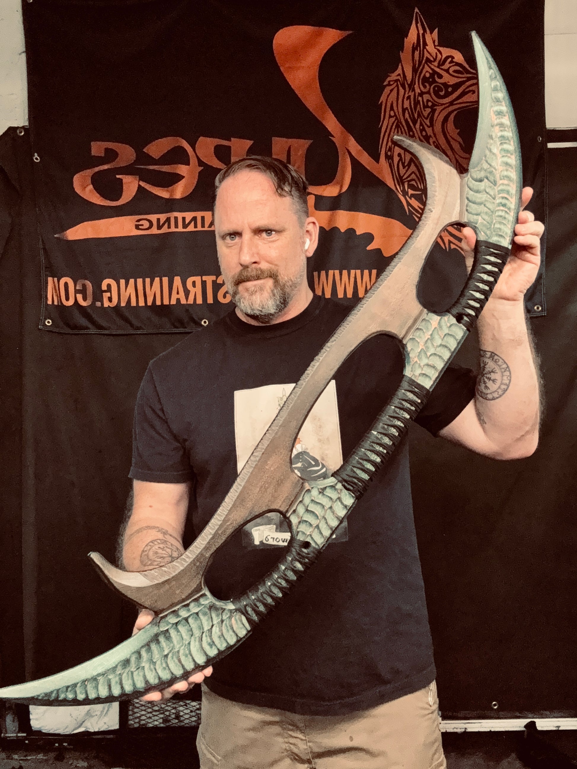 Handcrafted from 3/4” thick HDPE polymer. Honor and Glory will be yours, so train hard ! Hand ground and matched with resin infused Tsukamaki style handle. Detailed fullers and a hand textured finish and my Ancient Bronze patina finish . Overall length of 42”. Weighs 3lbs 10oz.