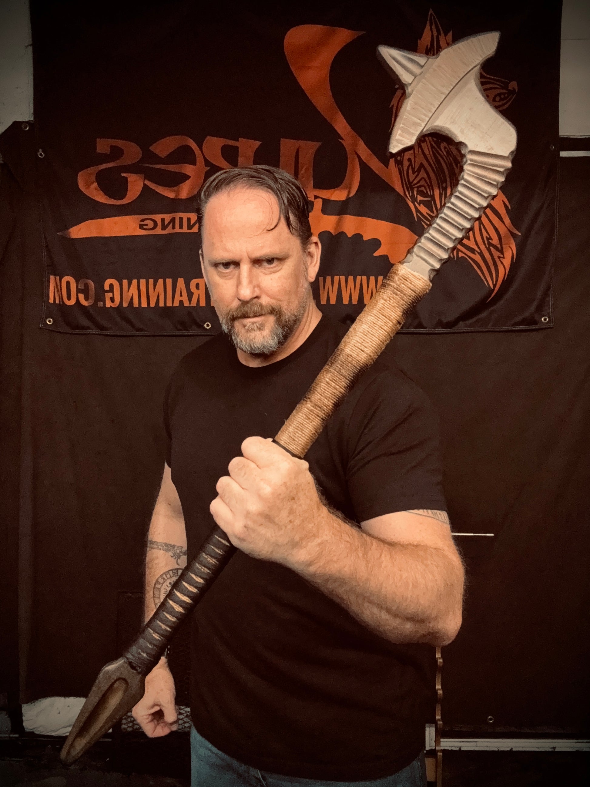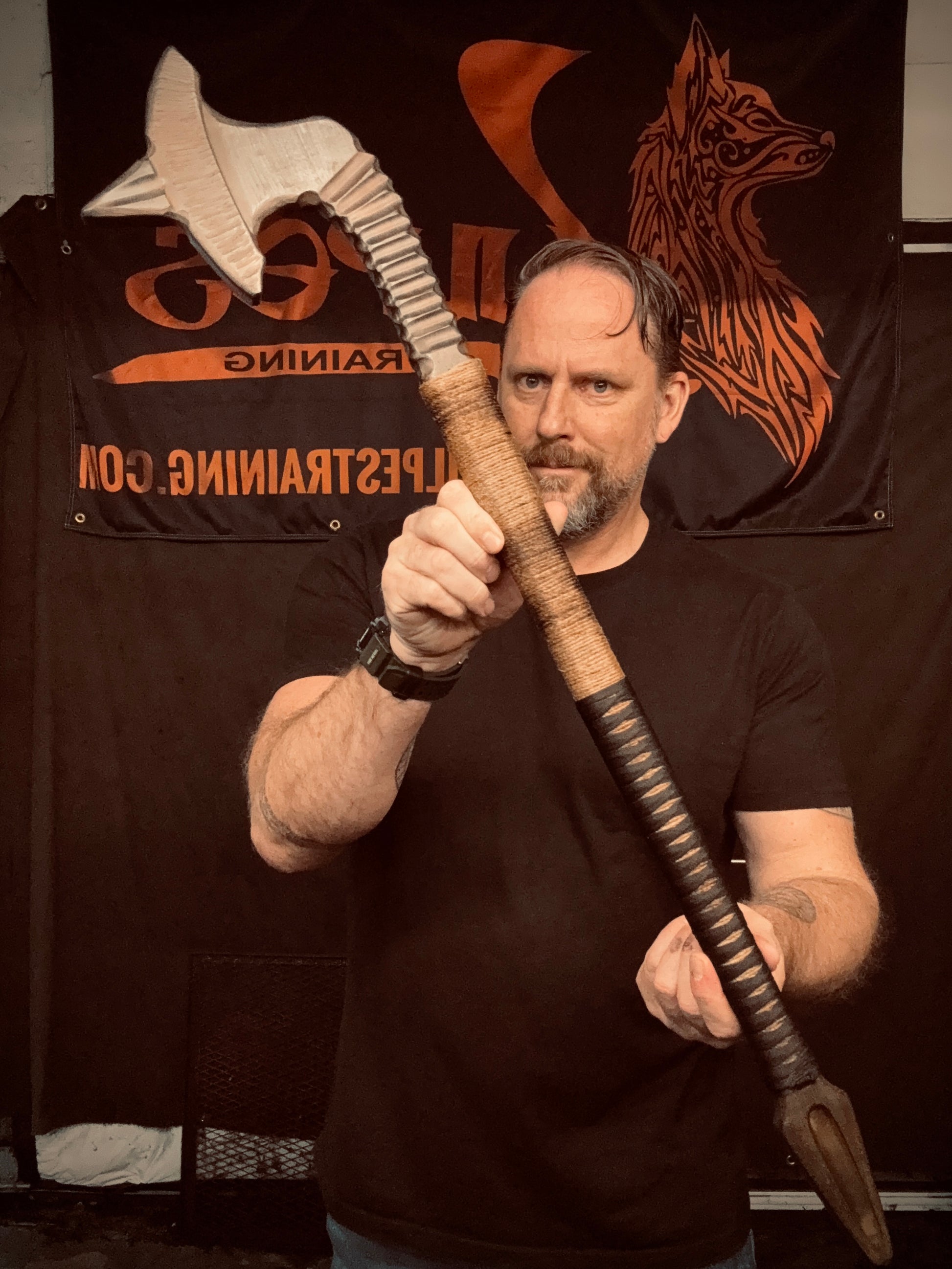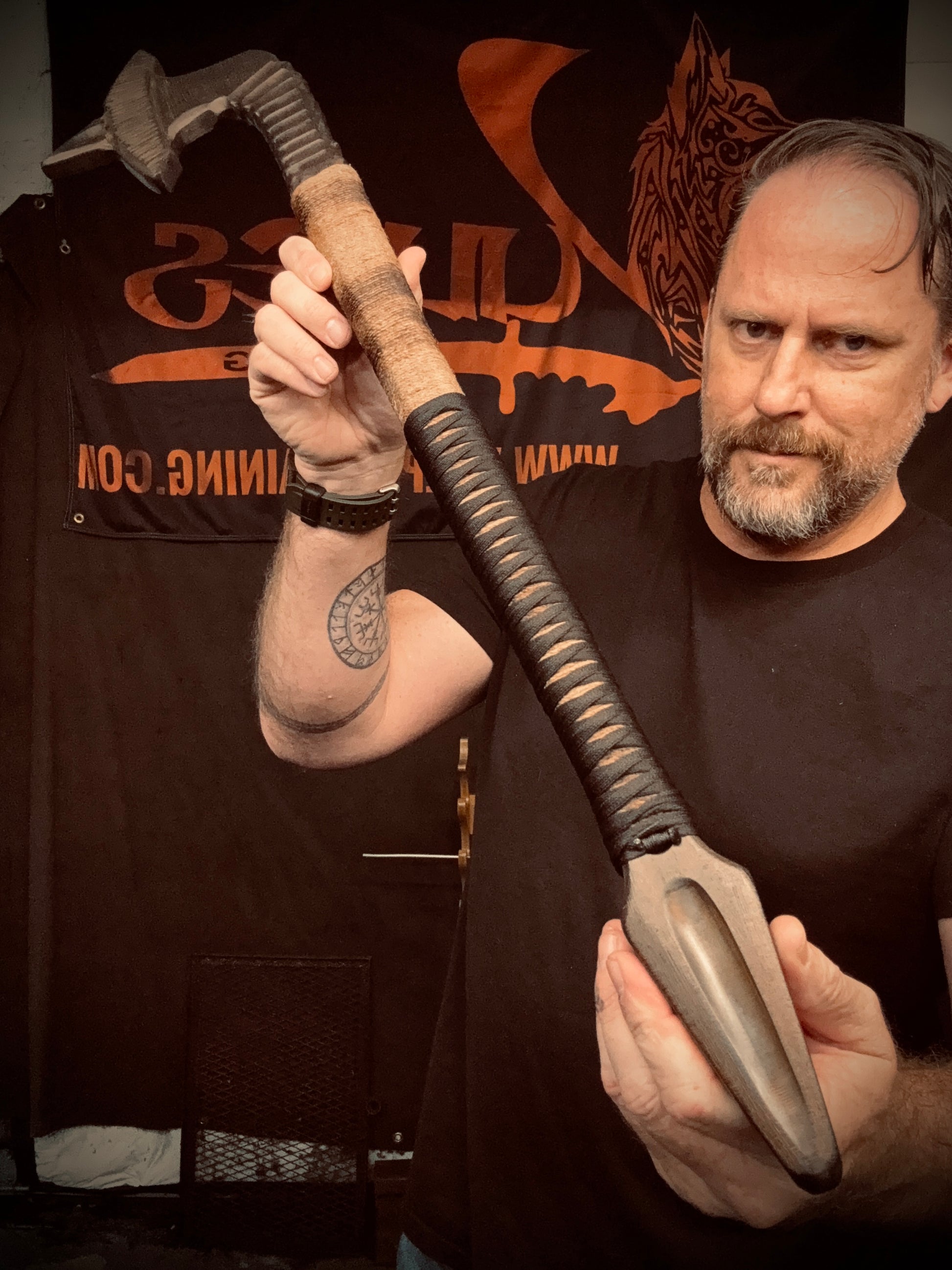 This war club is a collaborative design with Bladesmith Josh Waggoner. Blade smith , author and artist and martial artist Josh Waggoner is the designer of the popular Priscilla Bush Sword . His custom swords , knives and kerambits are designed with a keen users knowledge.