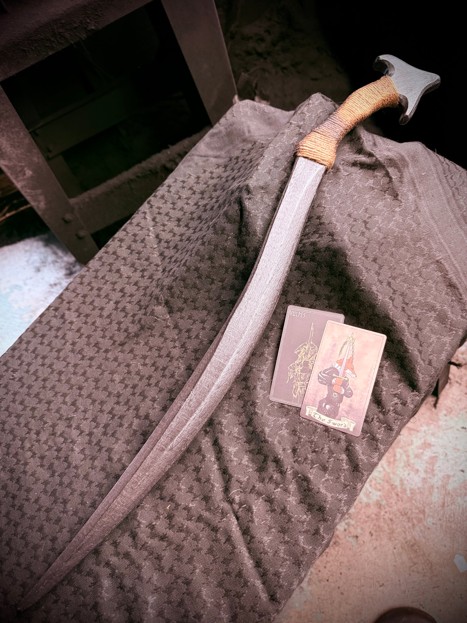 The garab is a traditional Filipino sword of the Eastern Vasayas . Handcrafted from 3/4” thick HDPE polymer, the 20.5” hand ground blade is matched with a flame treated jute wrapped handle. The jute is infused with marine grade resin to create a grippy and permanent , phenolic handle wrap. The handle is sized to accommodate a spare glove. Blade and pommel feature our hand textured wood grain finish. 27” overall length Weighs 14oz.