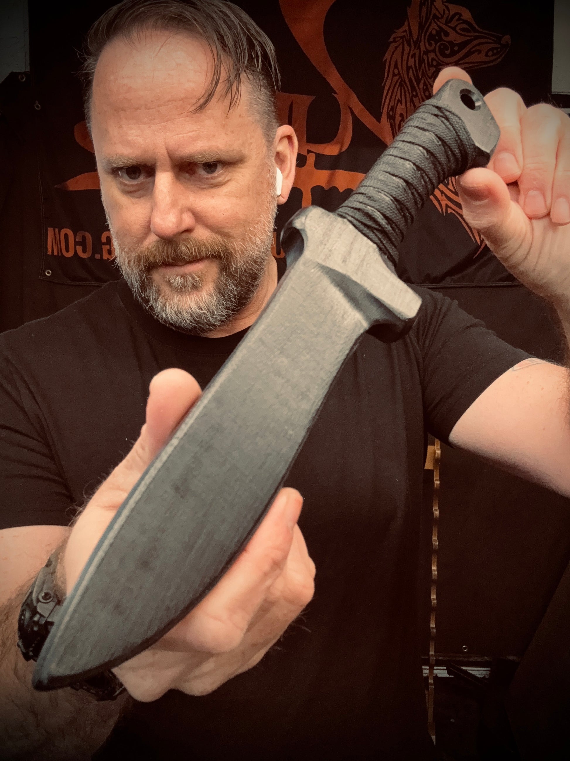 A knife trainer that fits the needs of the soldier , hiker or outdoorsman. Handcrafted from 3/4” thick HDPE polymer. The 7” hand ground blade is matched with an ergonomically shaped handle that features a resin reinforced Tsukamaki style wrap. 12.5” overall length. Weighs 6.2 oz.