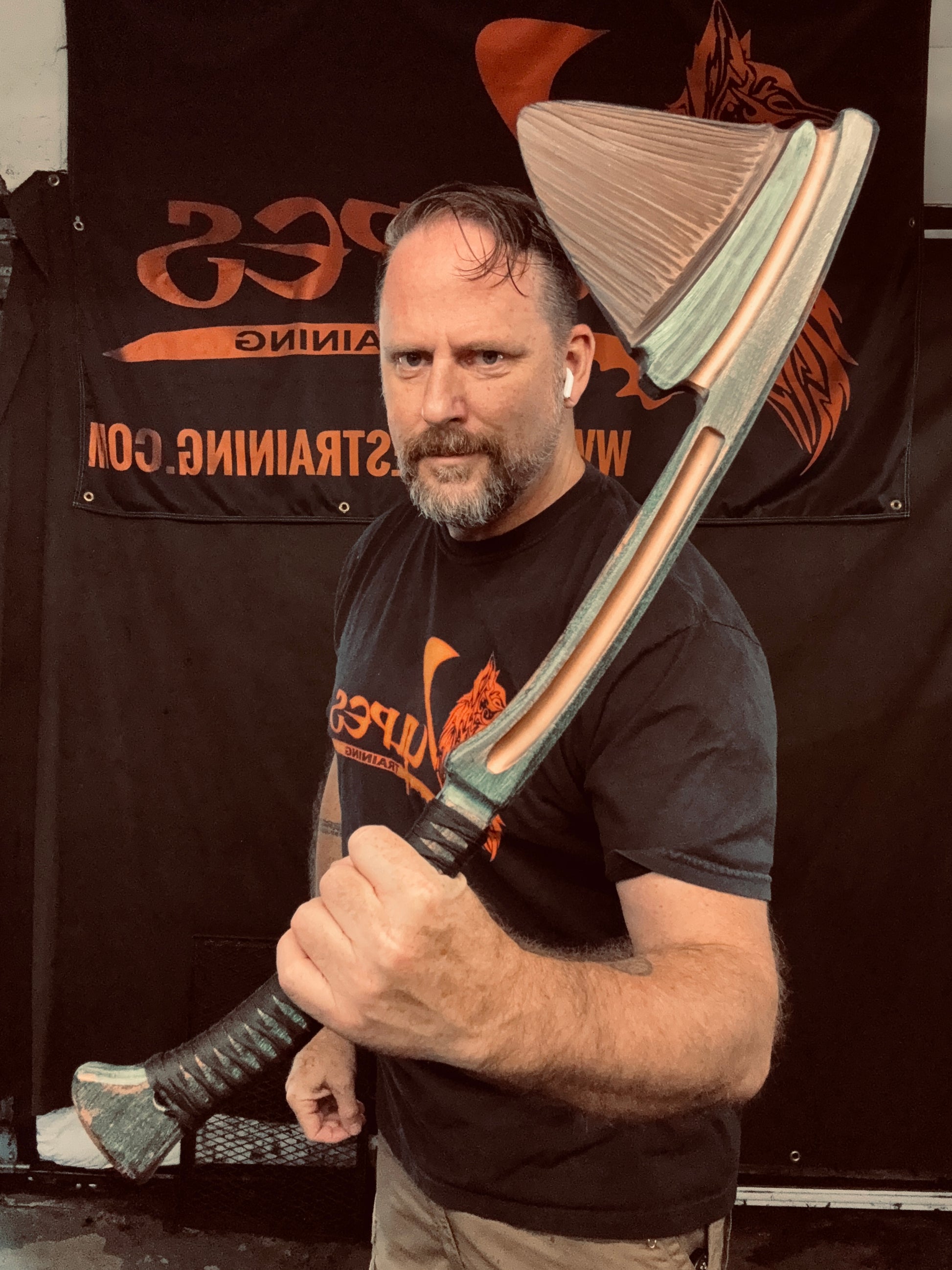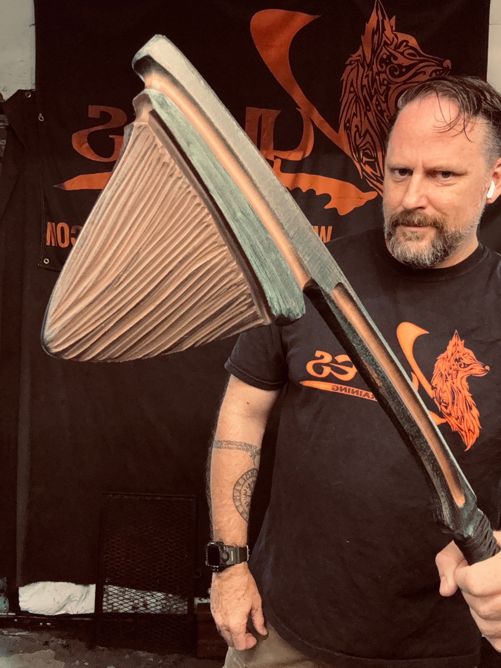 The Megalodon Axe is handcrafted from 3/4” thick HDPE polymer. It’s a rugged trainer or a fantastic cosplay prop. The 6” long tooth blade is mounted to a handle wrapped with a resin infused Tsukamaki style wrap. My Ancient Bronze patina finish completes the package. 28 “ overall length. Weighs 12.2 oz.