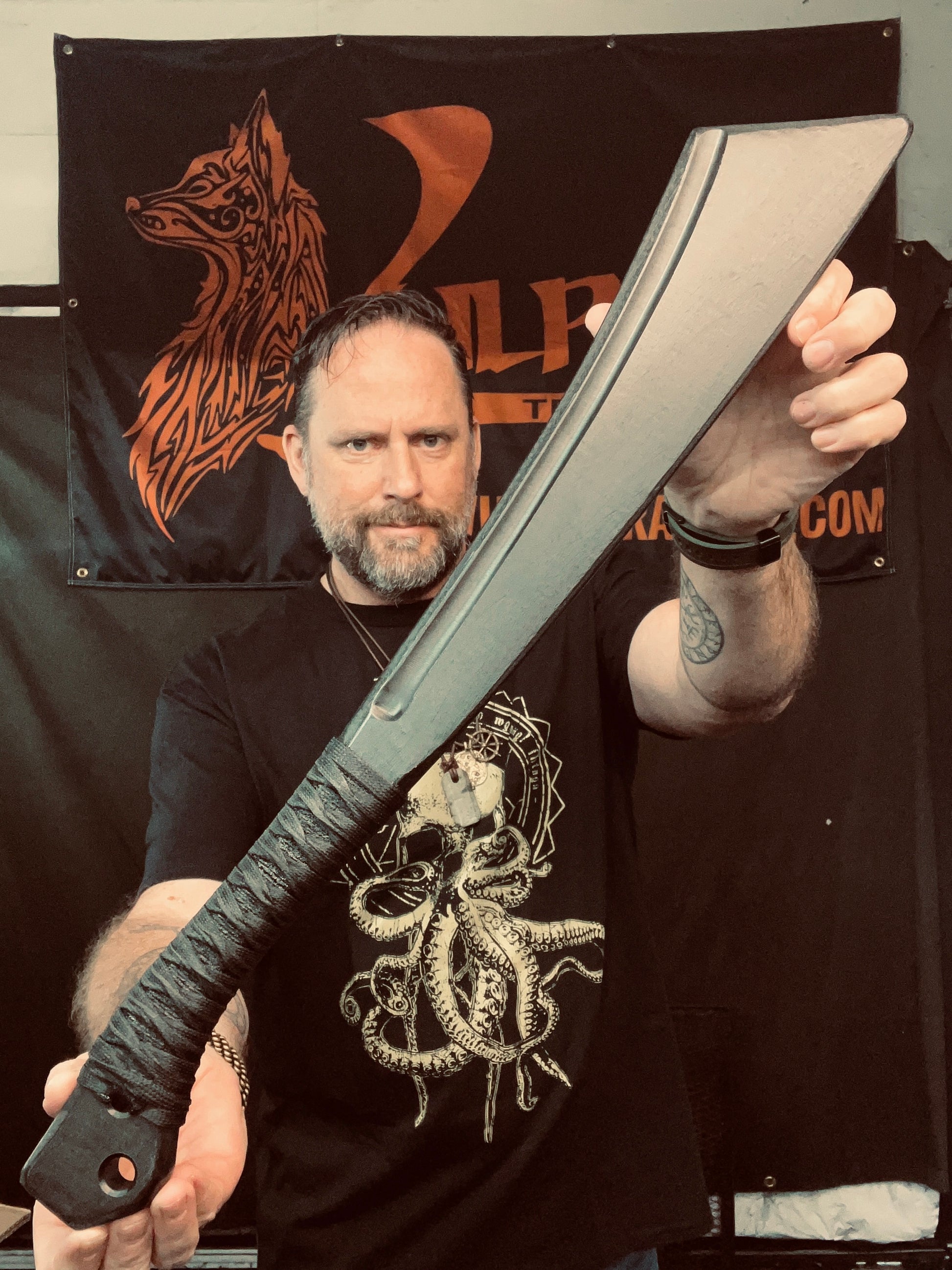 A fierce war club that handles like a sword! Handcrafted from 3/4” thick HDPE polymer. This 24” war club features a handle that is wrapped with a layer of black flame treated jute . It is then covered with a Tsukamaki style wrap and is saturated with marine grade resin to create a grippy and permanent handle wrap. Blade and pommel feature our hand textured wood grain finish. Weighs 1lb 3oz.