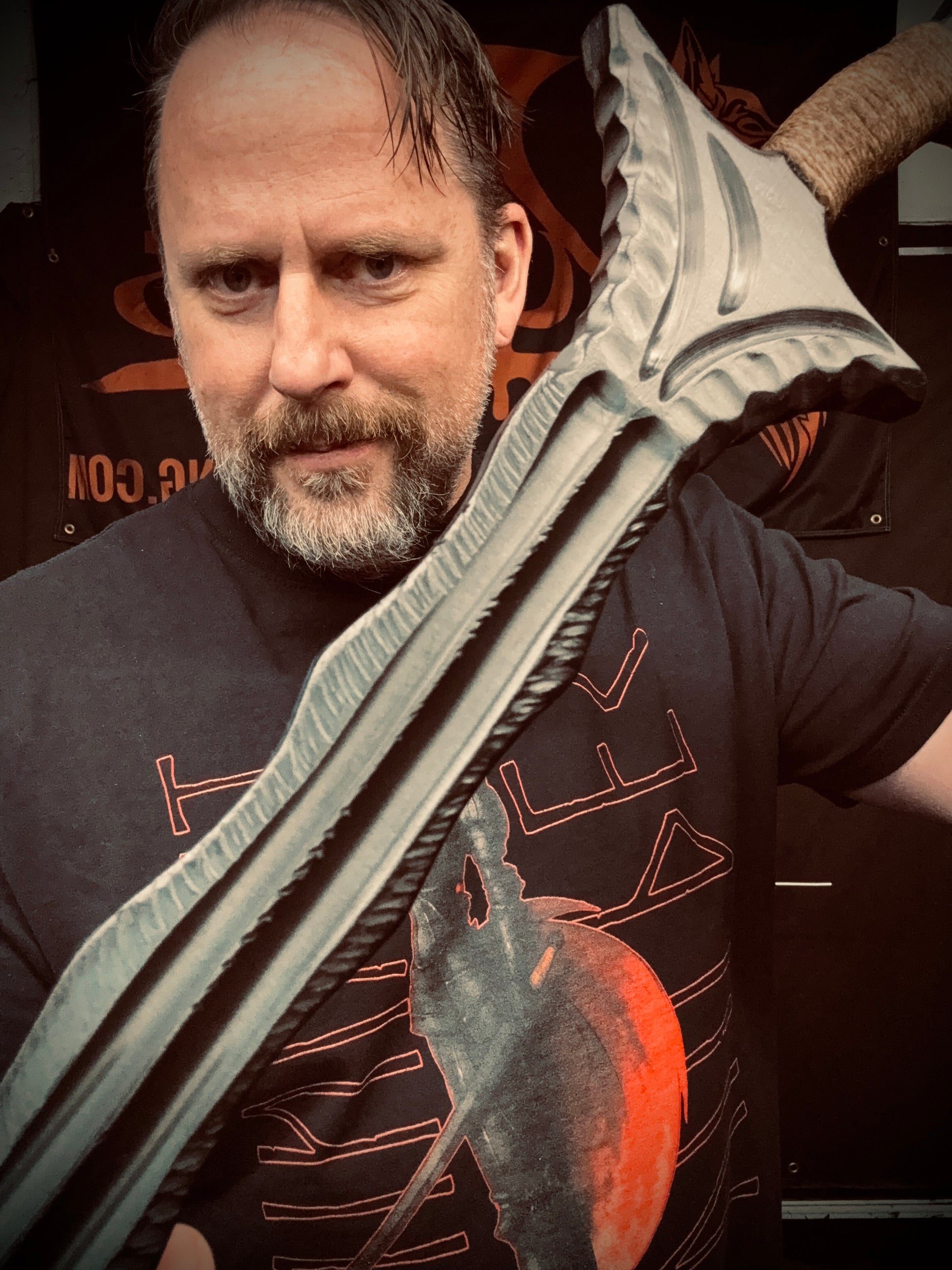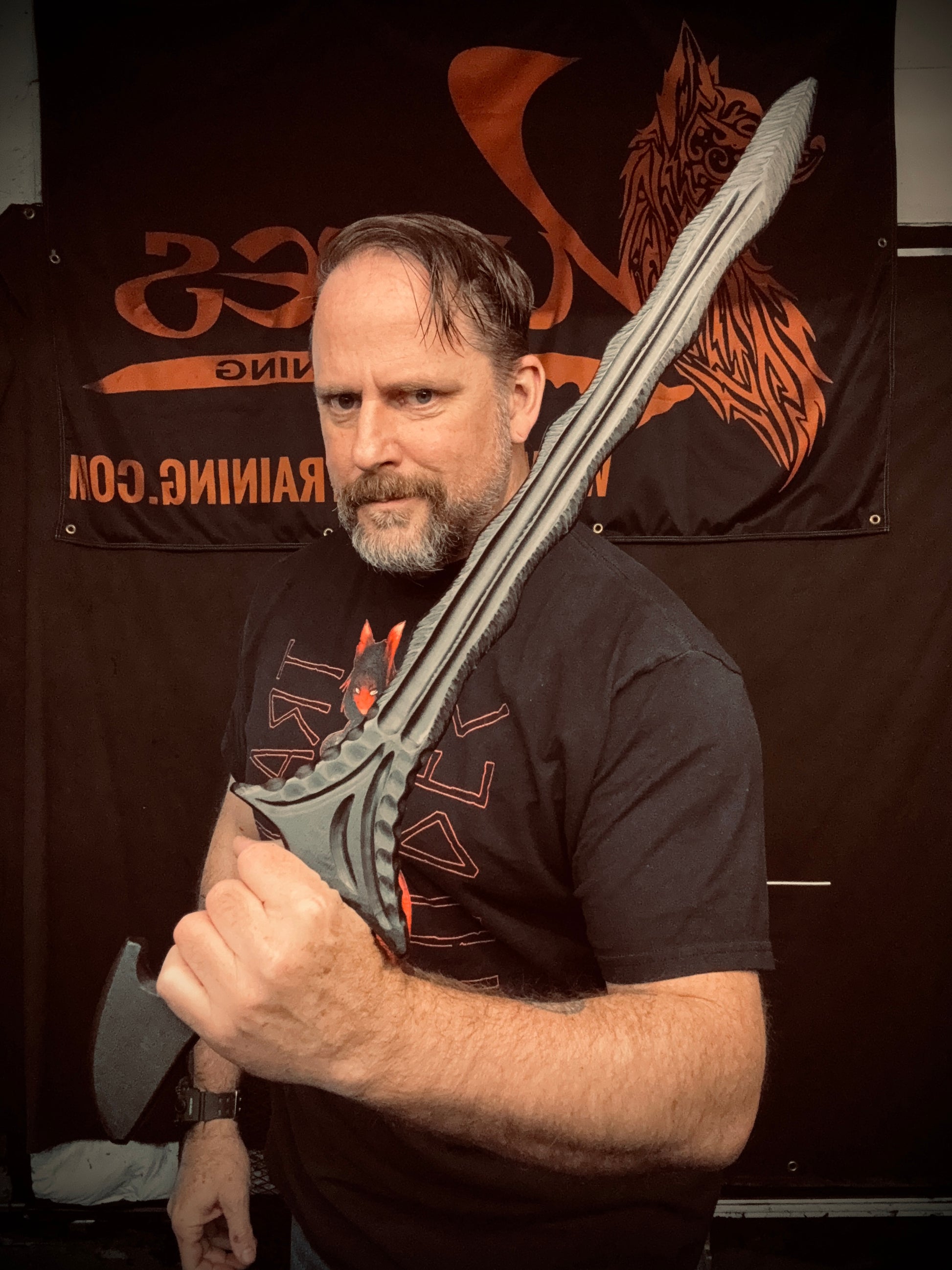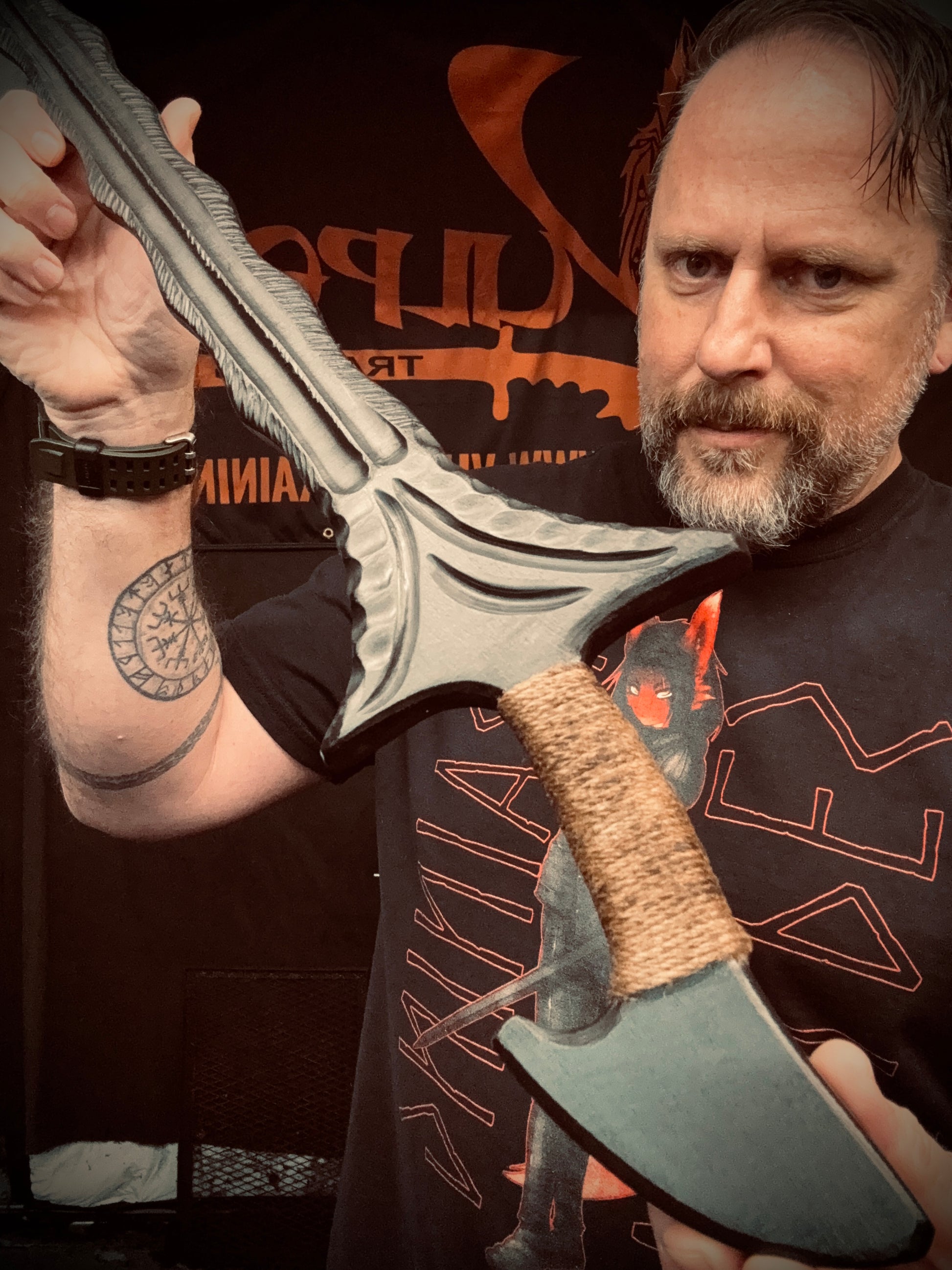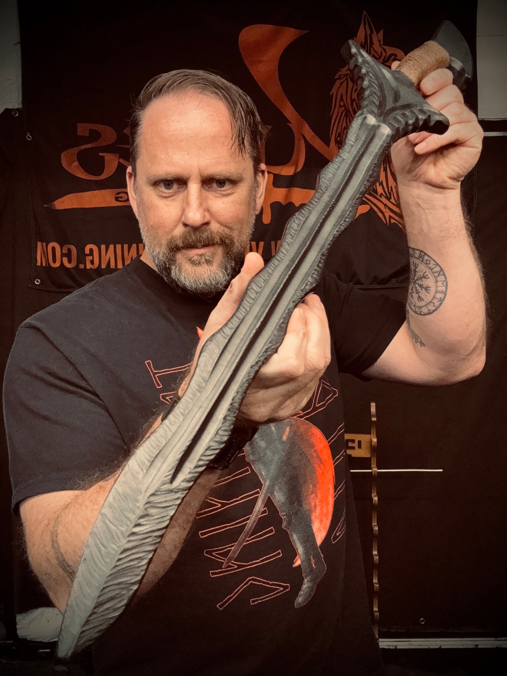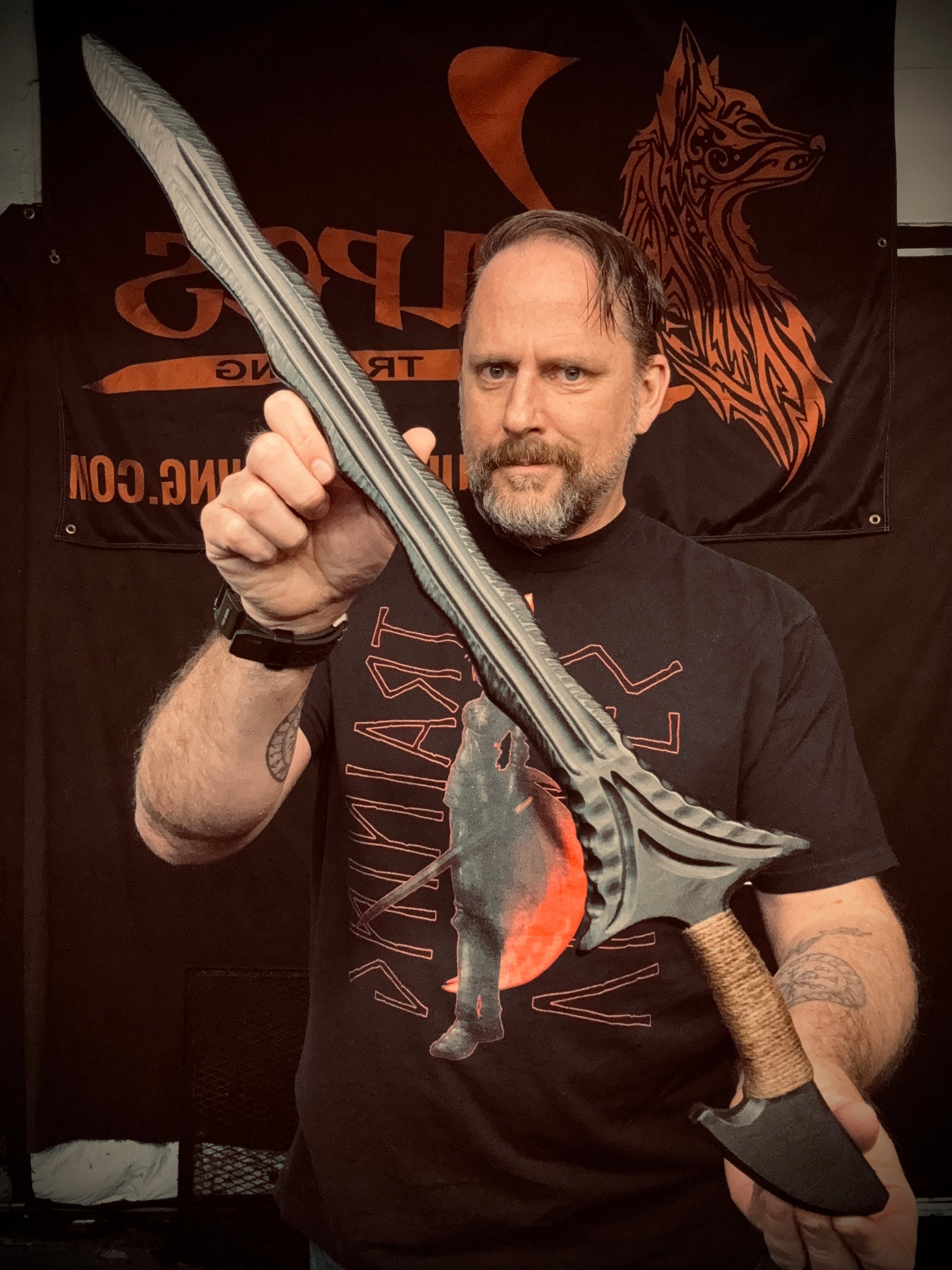 Handcrafted from 3/4” thick HDPE polymer . With a 22” hand ground blade that is matched with a flame treated jute wrapped handle. The jute is infused with marine grade resin to create a grippy and permanent handle wrap. This version features my meticulously hand textured carving and double fullers . 28” overall length . Weighs 1 lb .