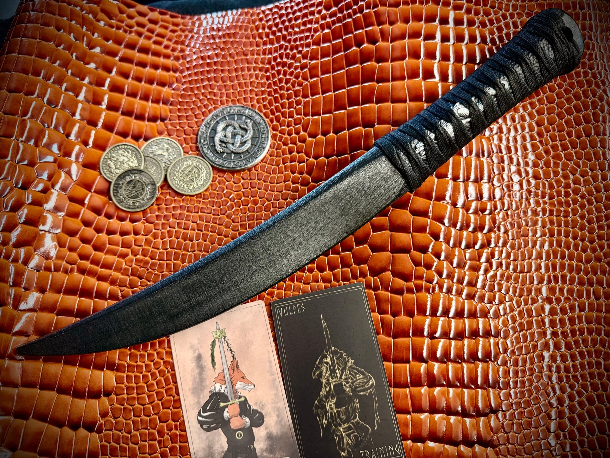 Handcrafted from 3/4” thick HDPE. 15” overall length and featuring a 9.5” blade. The handle is wrapped with a Tsukamaki style wrap over synthetic marine leather and a dragon menuki and is saturated with marine grade resin to create a grippy and permanent handle wrap. Weighs 6.2 oz.