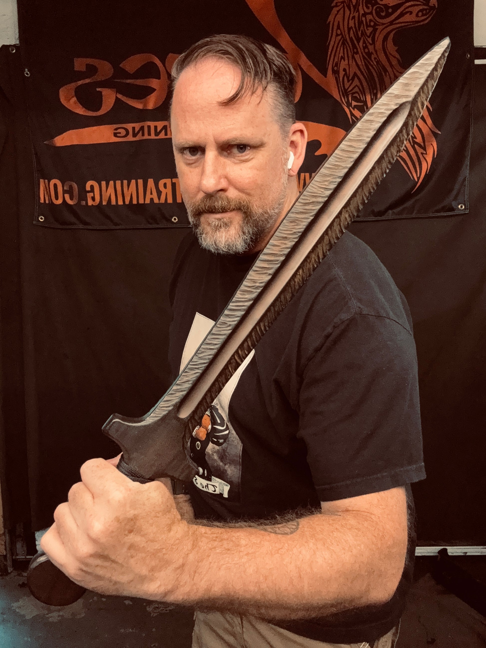 The Halfling Wraith Sword is a dark retelling of the blade that hobbit once carried. Handcrafted from 3/4” thick HDPE polymer. Its 18” hand textured and fullered blade features a weathered patina. The handle features a hand wrapped, resin infused Tsukamaki style wrap with an underlayer that gives a deadly glow in the present foes. 24.5” overall. Weighs 1 lb 5 oz.