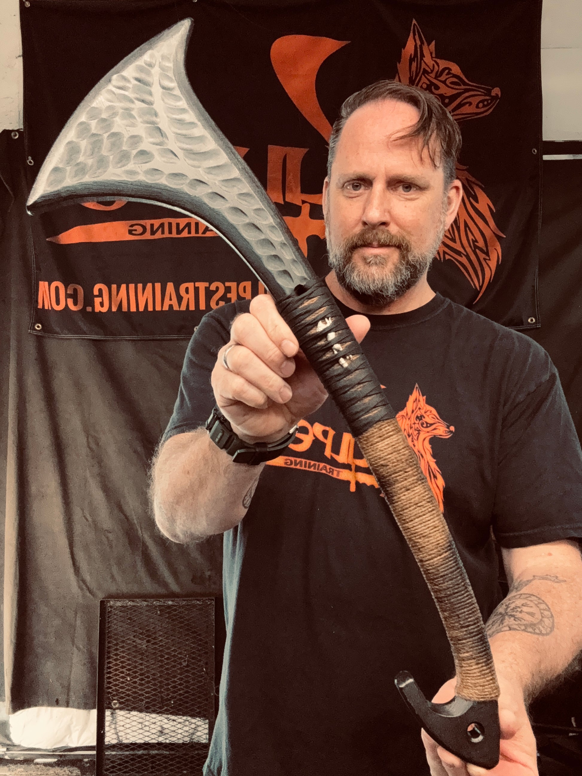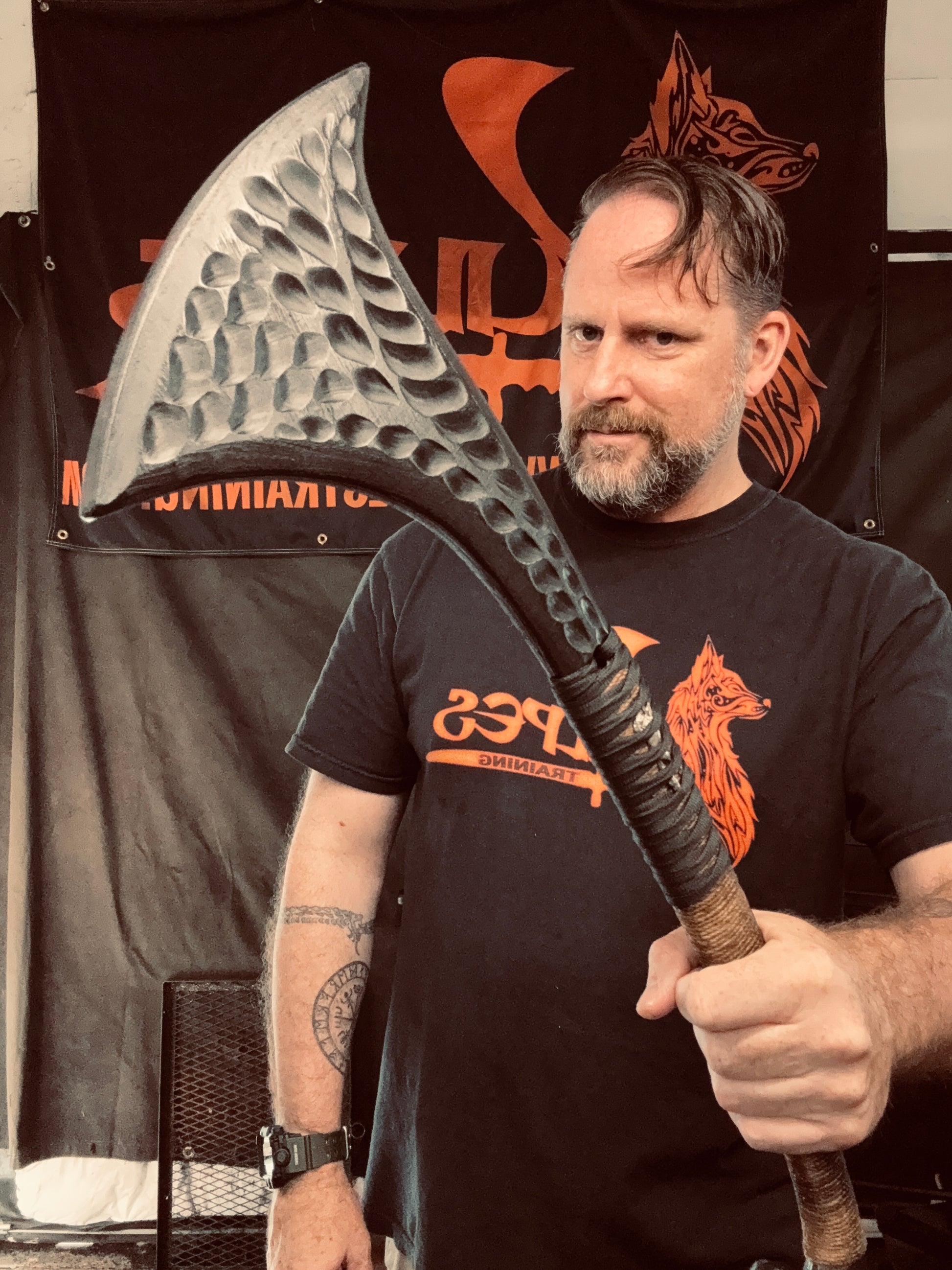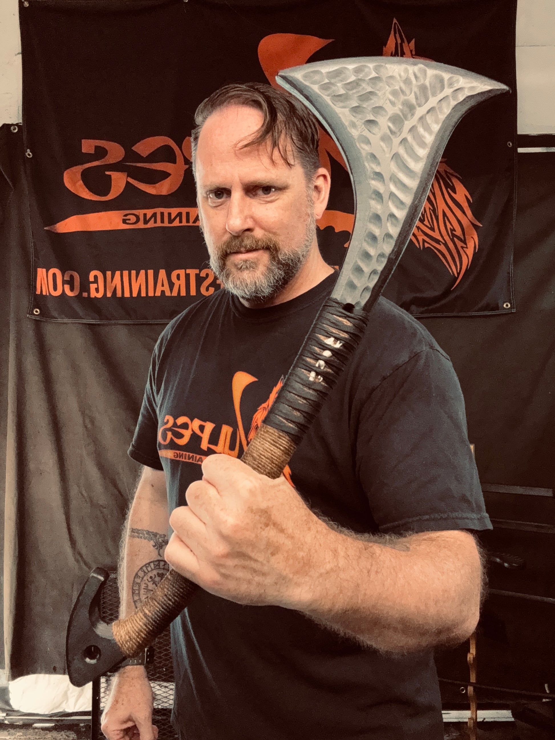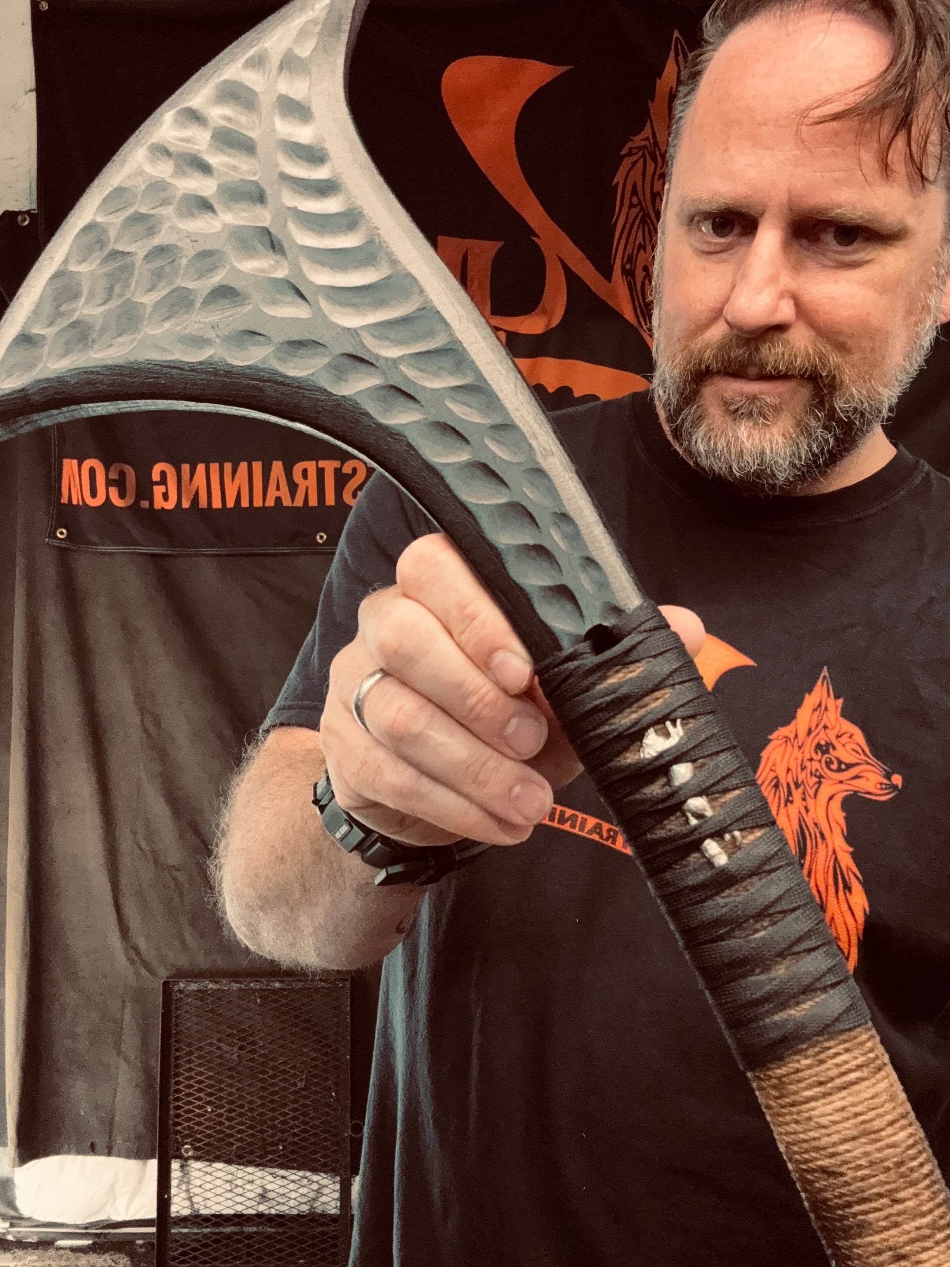 A Clay Latiolais design. Clay has a sharp eye for design. His The Way war club is no exception. Handcrafted from 3/4” thick HDPE polymer. It’s 24” overall length is balanced for powerful swings. The hooked pommel keeps it securely in your grasp. The blade features our hand textured Dragon Hide finish . The handle is wrapped in flame treated jute that has been infused with marine grade resin then partially wrapped in a resin infused Tsukamaki style wrap. . Weighs 1 lb 3 oz.