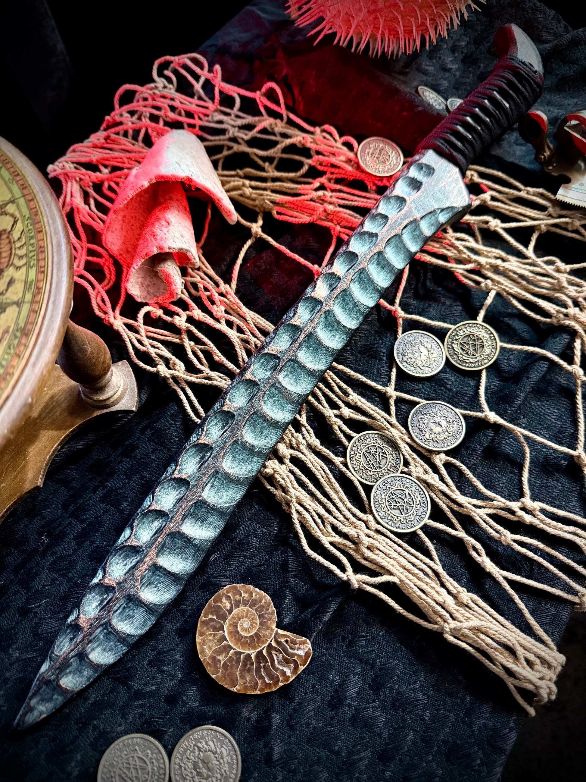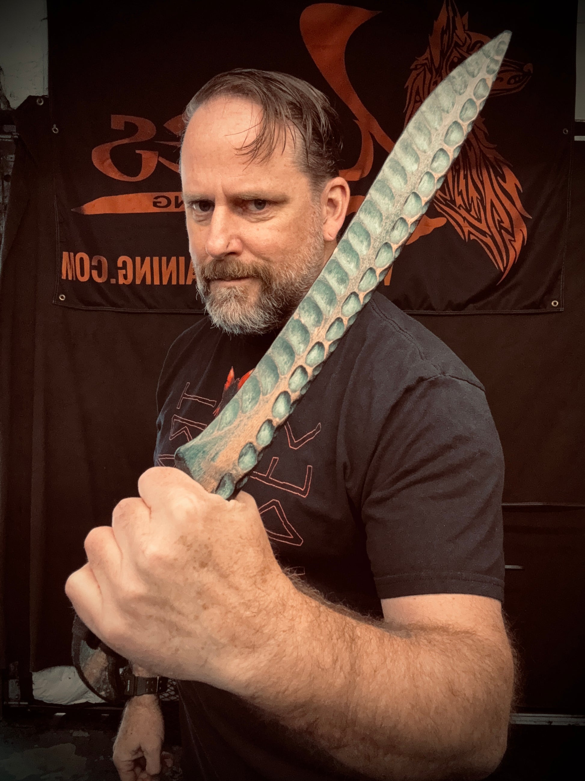 Handcrafted from 3/4” thick HDPE polymer . The 14” hand ground blade is matched with hand wrapped handle with a black tsukamaki style overwrap. The handle wrap is infused with marine grade resin to create a grippy and permanent , phenolic handle wrap. Blade and pommel feature my hand textured Tiamat Finish and aged bronze patina. Overall length is 19 1/2” Weighs 10 oz.