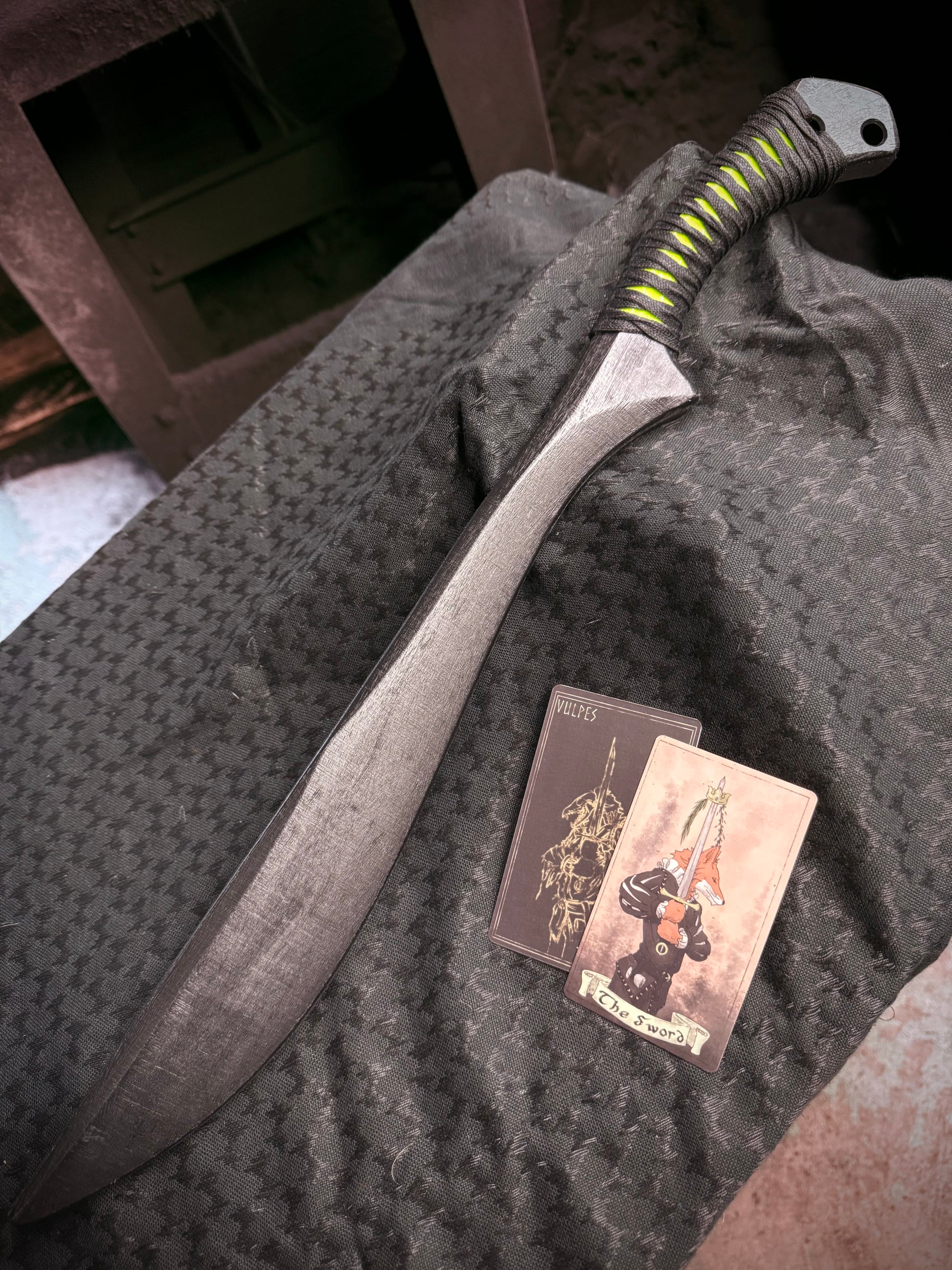 Handcrafted from 3/4” thick HDPE polymer. The hand ground 15 1/2 blade is matched with a Tsukamaki style wrapped handle . The wrap is infused with marine grade resin to create a grippy and permanent handle wrap. This version features our hand textured wood grain finish 22” overall length. Weighs 11.7oz